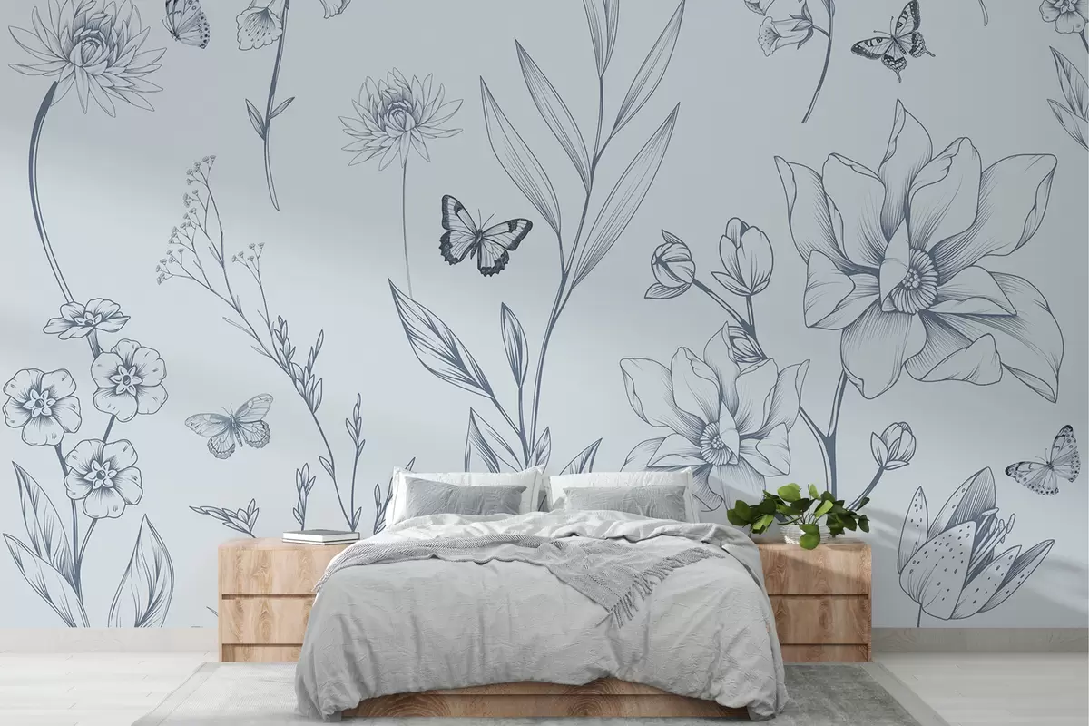 Fotomurales Flores y mariposas monocromáticas boho en azul Nr. w08088v2