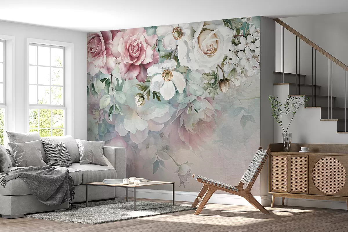 Fotomurales Arreglo floral en tonos pastel suaves con rosas rosadas, flores blancas y follaje verde. Nr. w08153