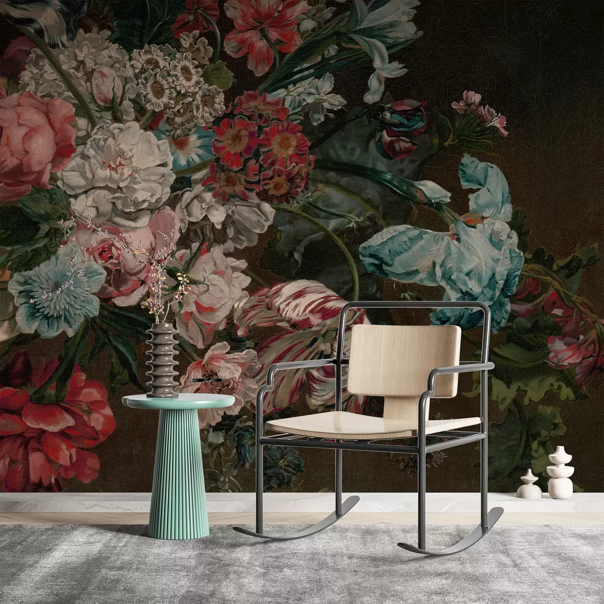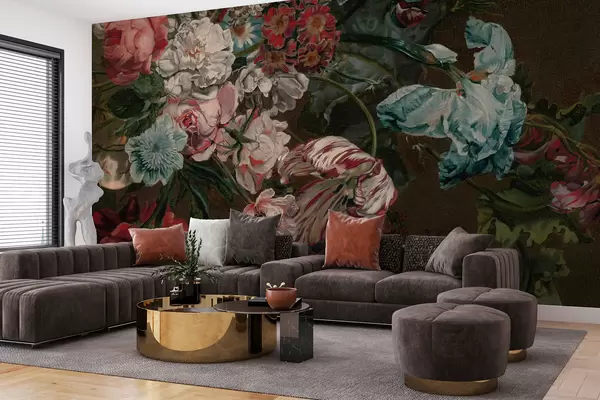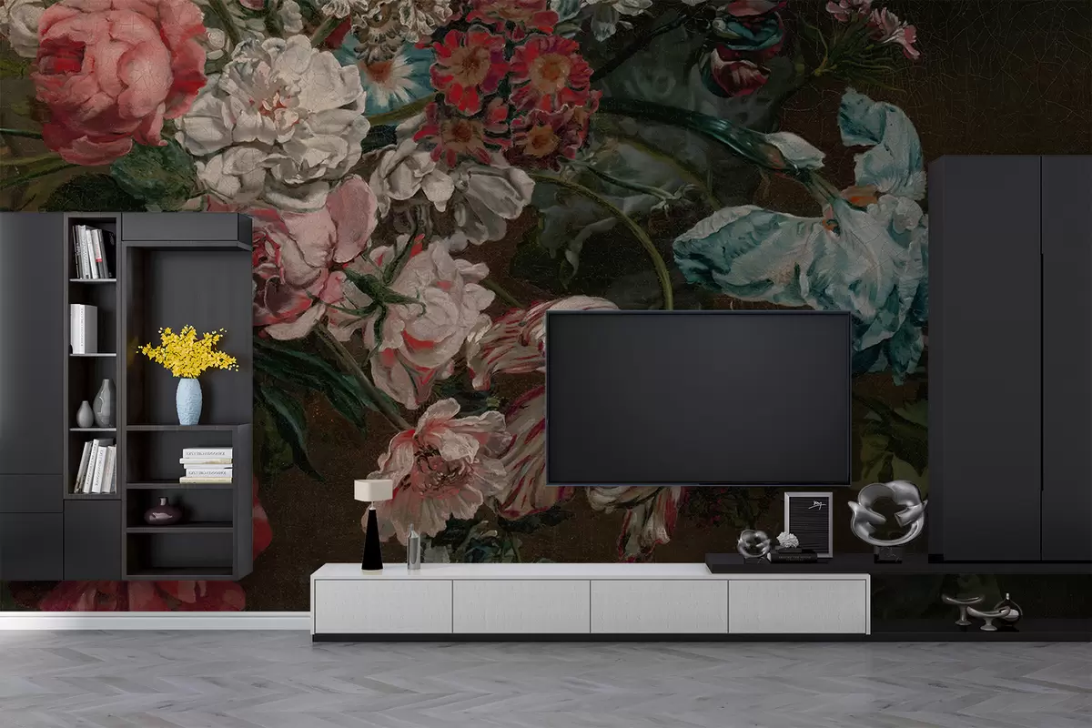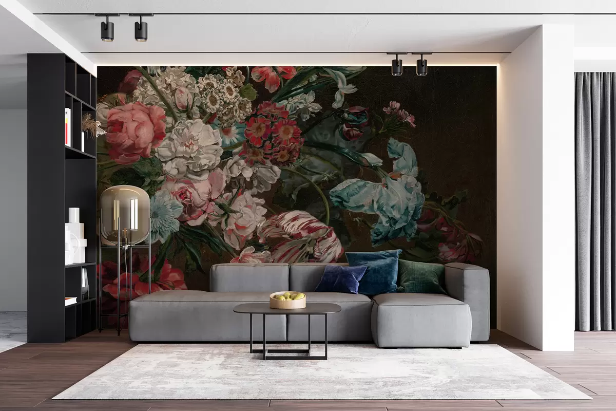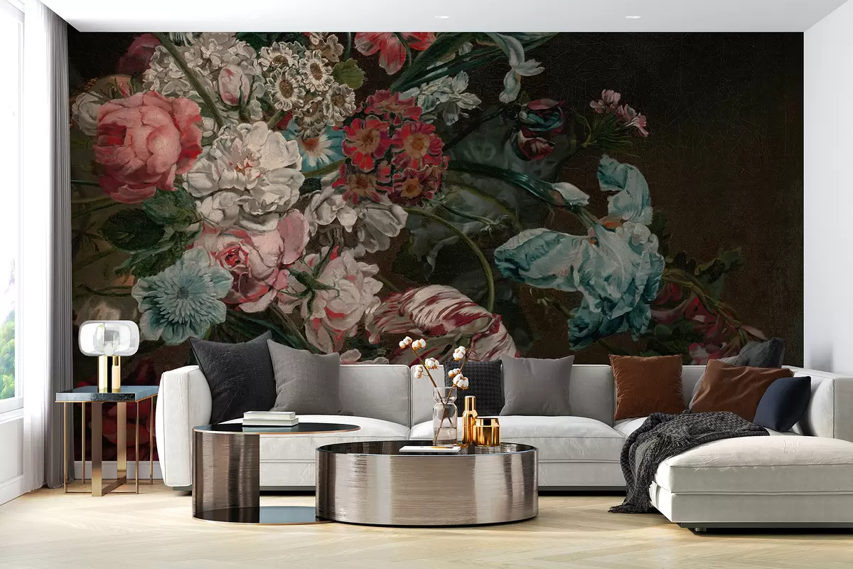 Fotomurales Flores coloridas vintage que incluyen peonías rosas, claveles rojos y lirios blancos sobre un fondo oscuro. Nr. w08163