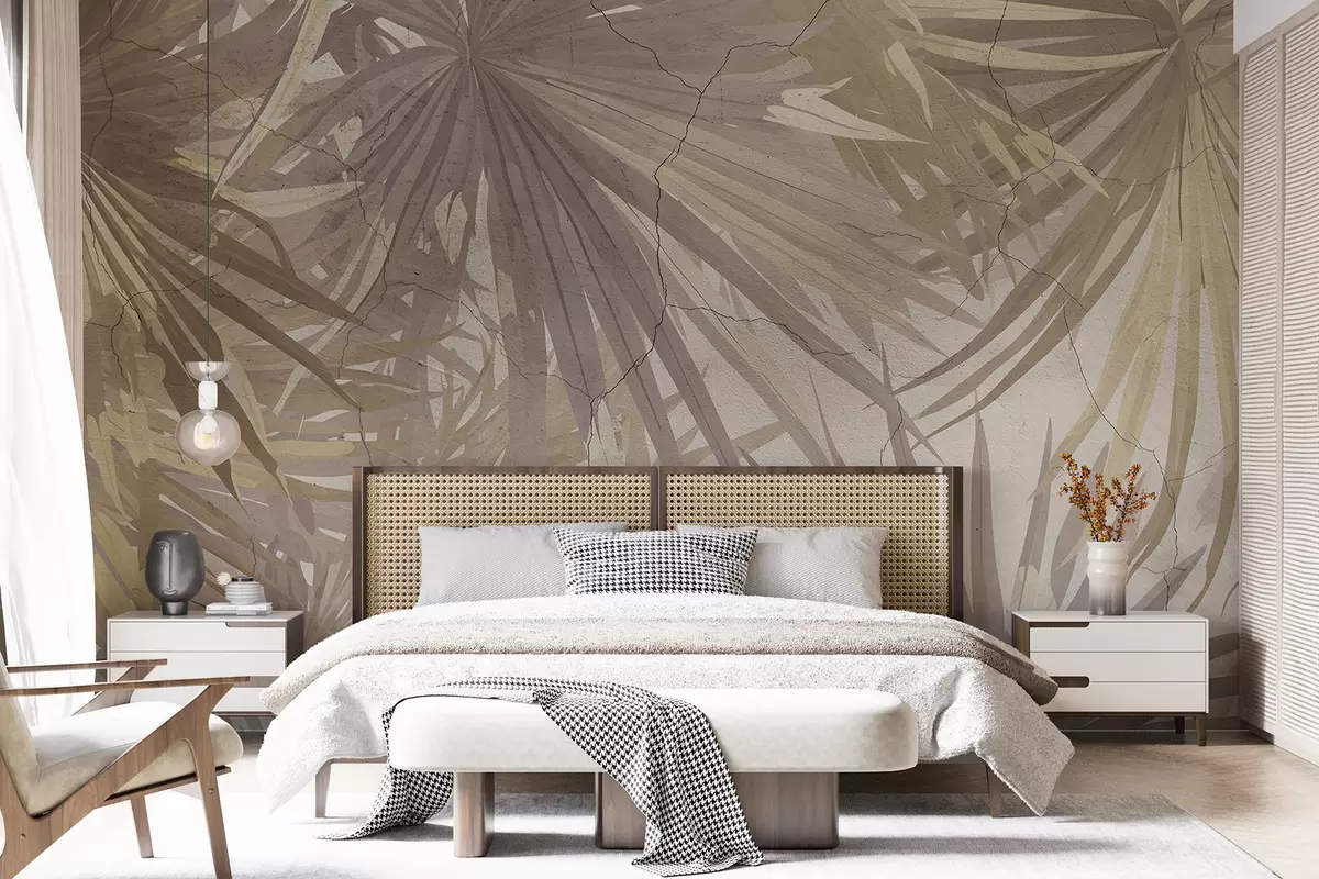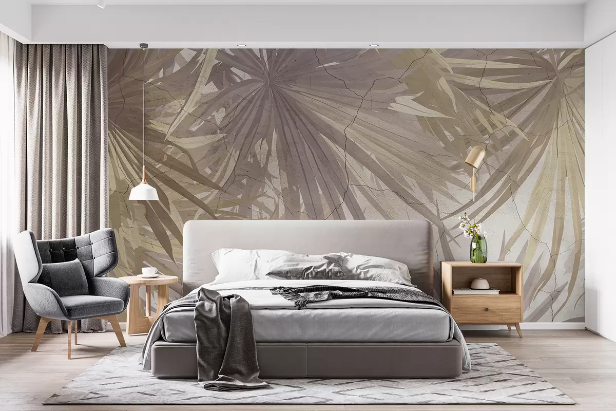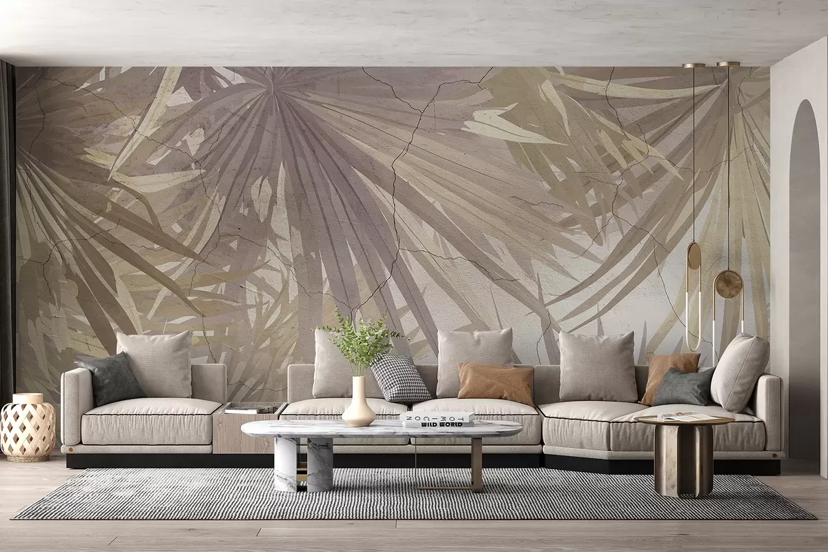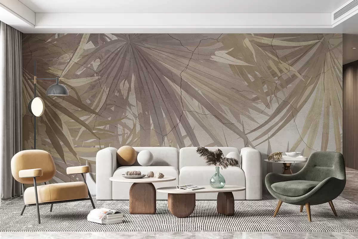 Fotomurales Follaje tropical exuberante con grandes hojas de palma marrones sobre un fondo suave y brumoso. Nr. w08187v1