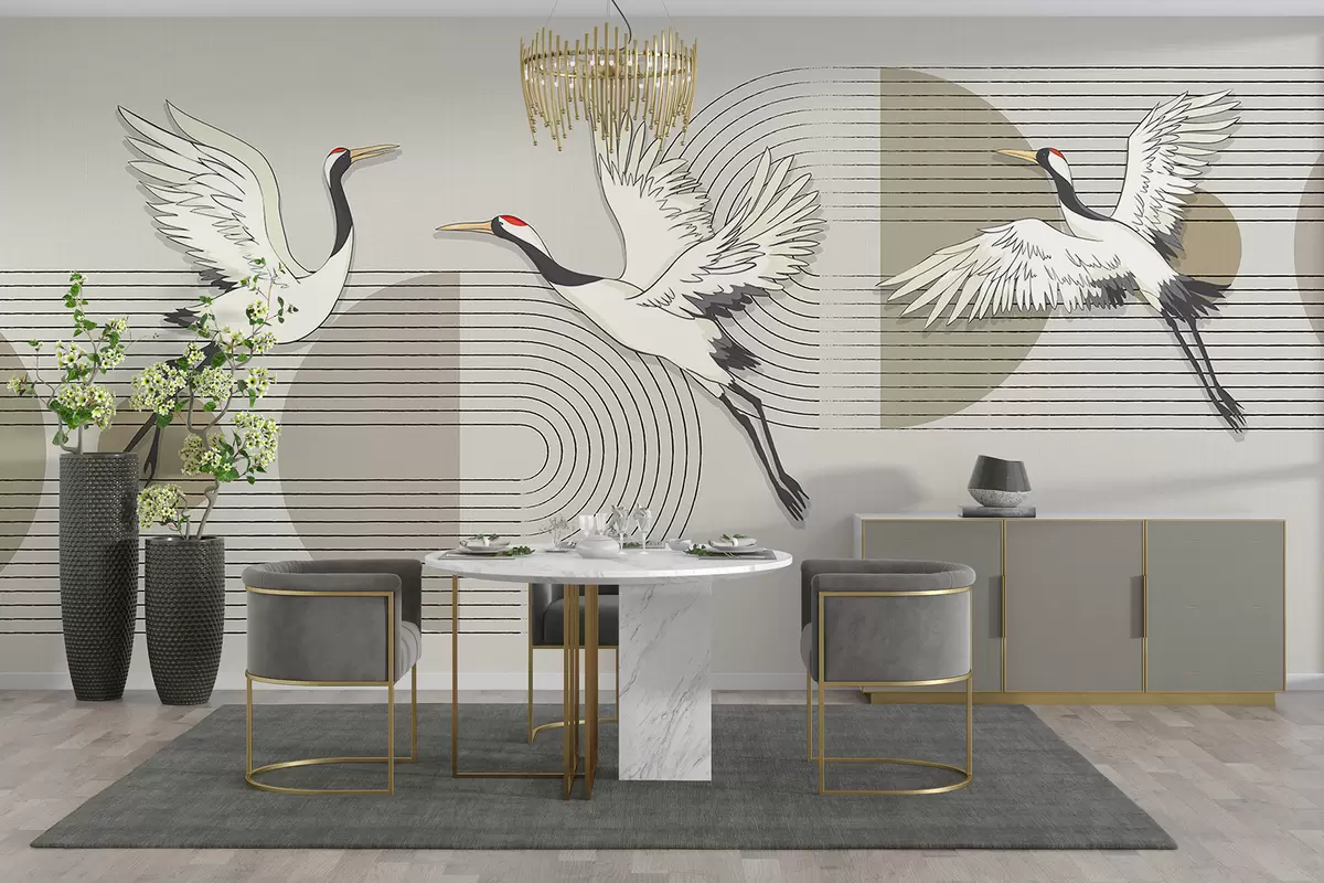 Fotomurales Tres grullas blancas en vuelo sobre un fondo geométrico minimalista con círculos concéntricos Nr. w08188