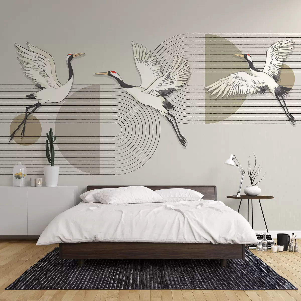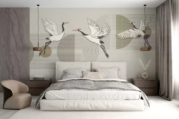 Fotomurales Tres grullas blancas en vuelo sobre un fondo geométrico minimalista con círculos concéntricos Nr. w08188