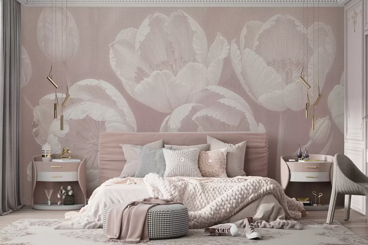 Fotomurales Dibujo de tulipanes blancos con fondo beige difuminado con textura de lienzo suave, impresión monocromática minimalista Nr. w08193