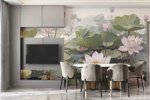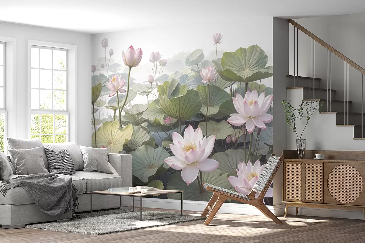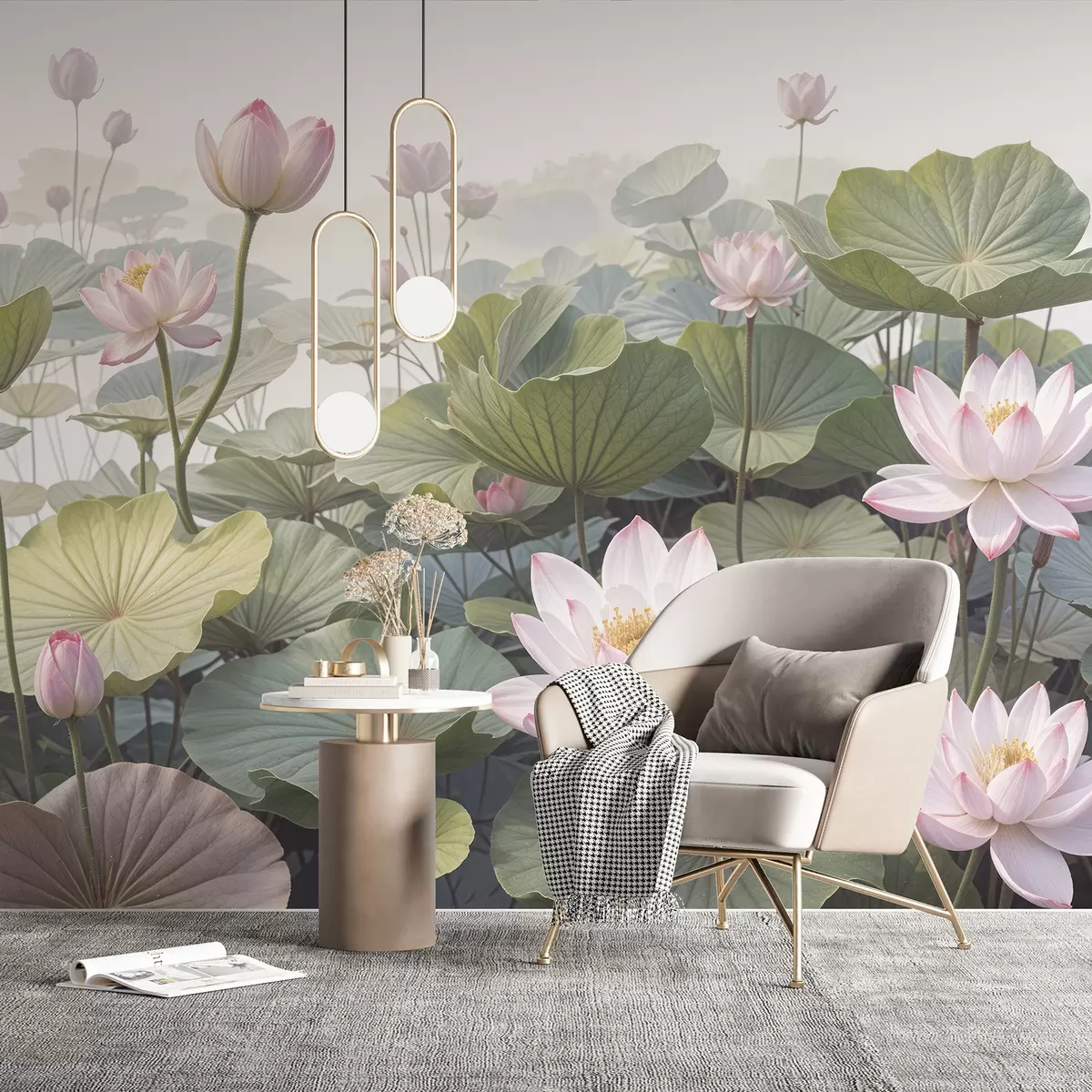 Fotomurales Flores de loto rosas y blancas con grandes hojas verdes, rodeadas de un fondo atmosférico y brumoso. Nr. w08221