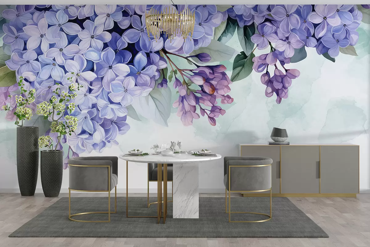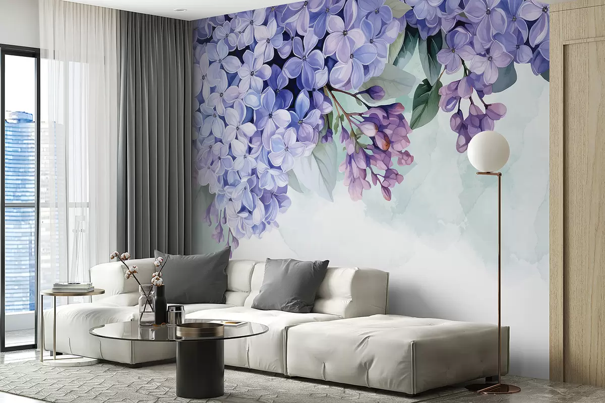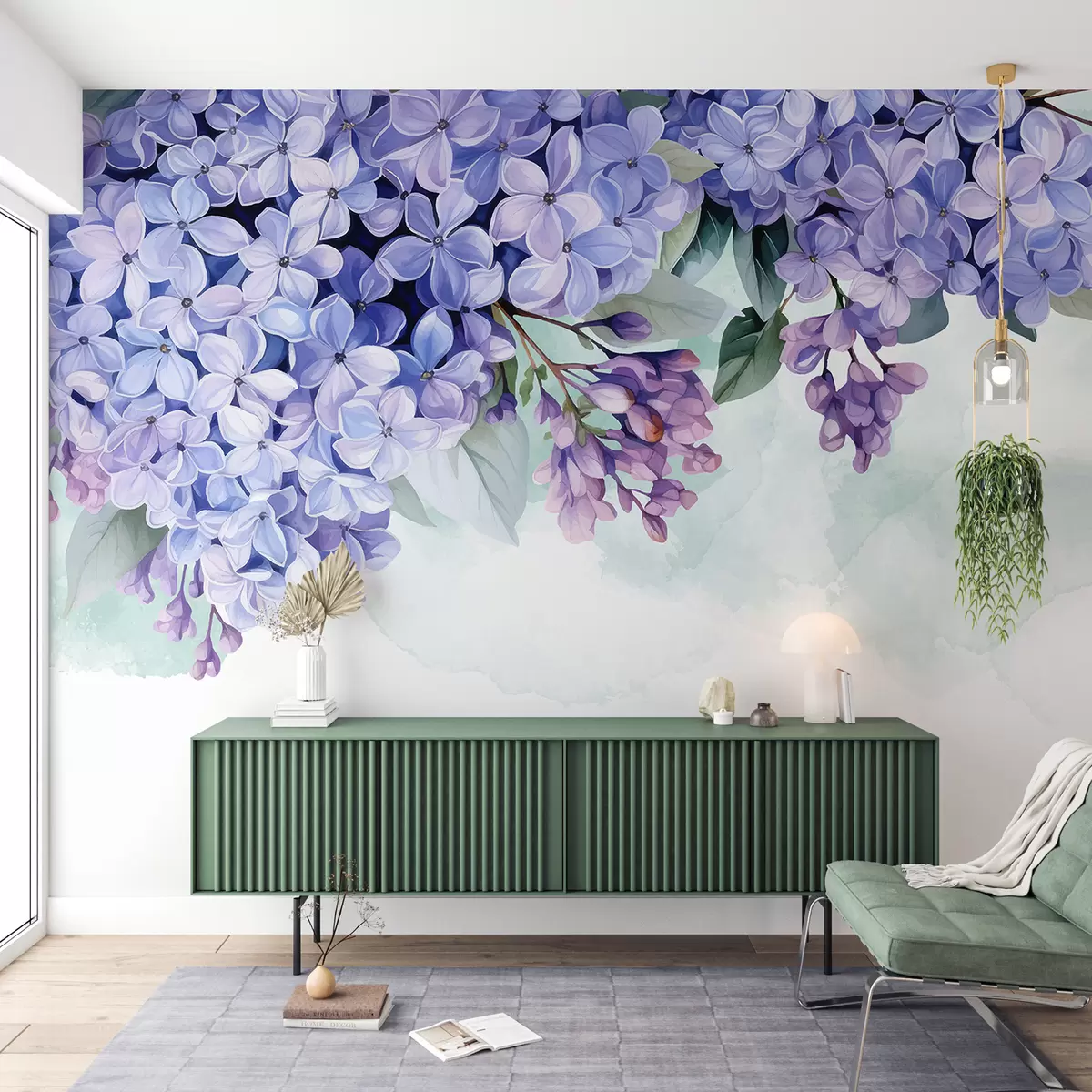 Fotomurales Flores de hortensia de color púrpura vibrante con hojas verdes, que llenan el marco contra un fondo suave y borroso. Nr. w08223