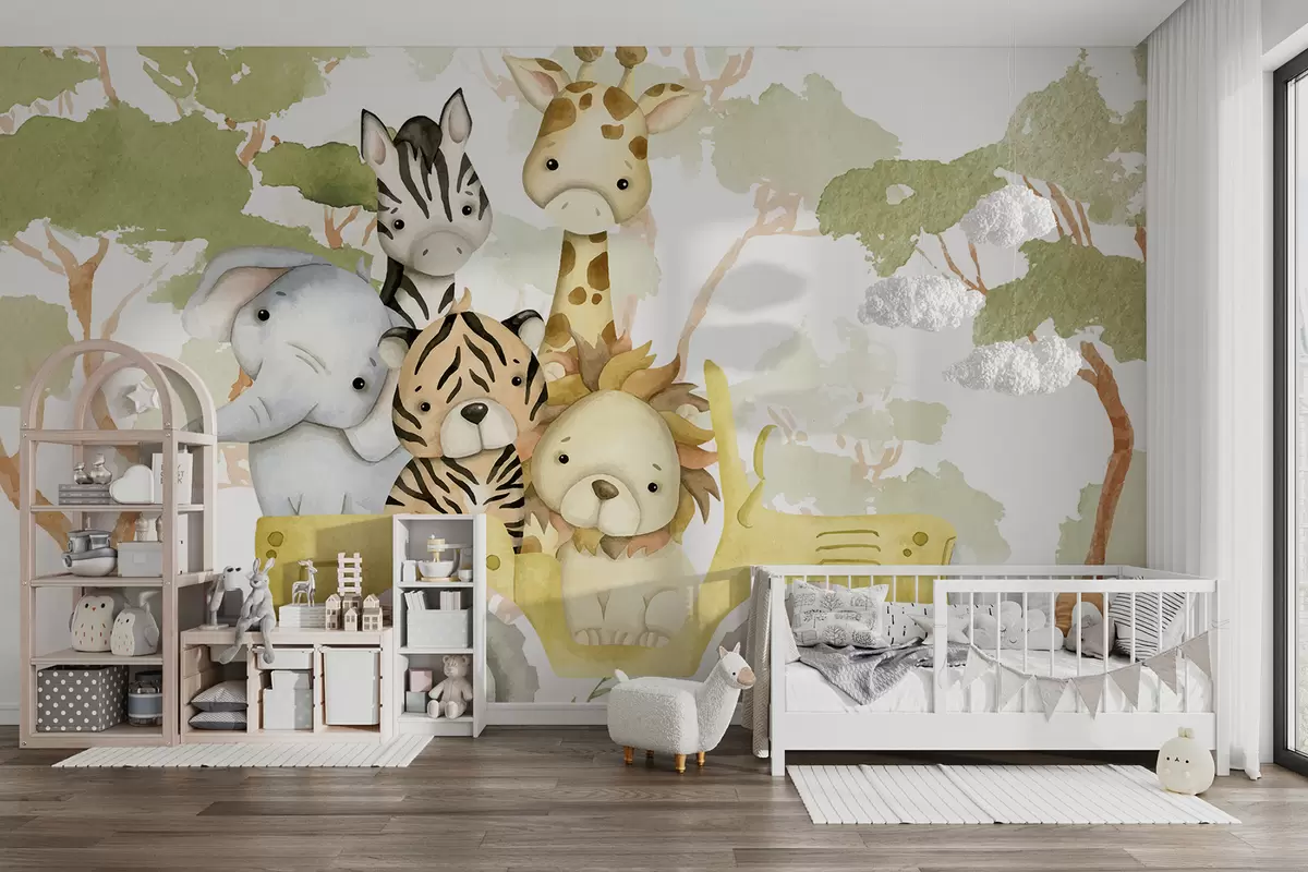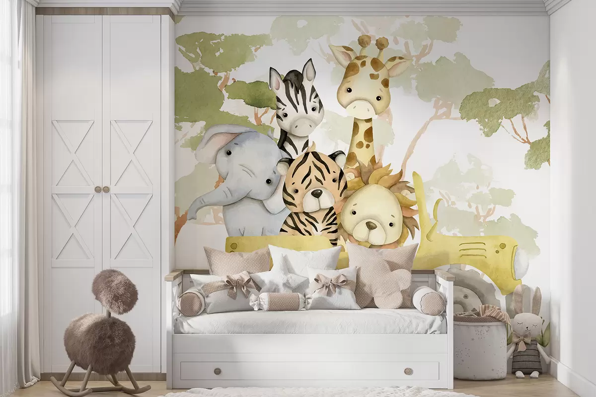 Fotomurales Un camión de juguete amarillo que transporta una jirafa, un tigre, un conejo y un elefante, sobre un fondo de follaje verde. Nr. w08233