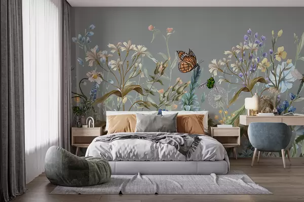 Fotomurales Una colorida ilustración azul de una escena de jardín de flores exuberantes con insectos en un estilo fantástico y onírico. Nr. w08234