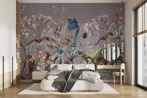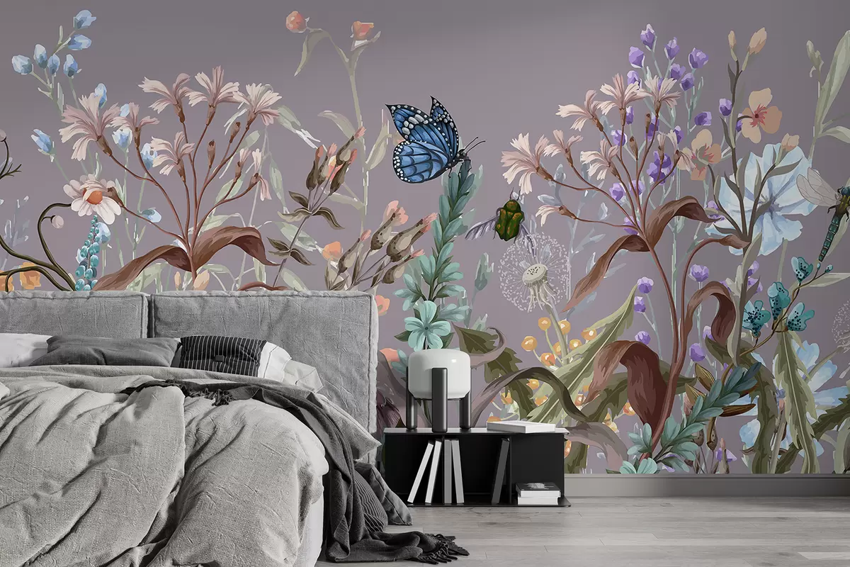 Fotomurales Una colorida ilustración violeta de una escena de jardín exuberante y florido con insectos en un estilo fantástico y onírico. Nr. w08234v1