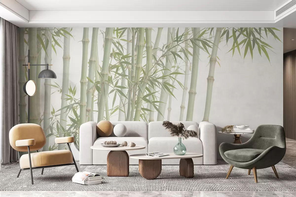 Fotomurales Un denso bosque de bambú con altos tallos de bambú y hojas verdes sobre un fondo suave y brumoso. Nr. w08237