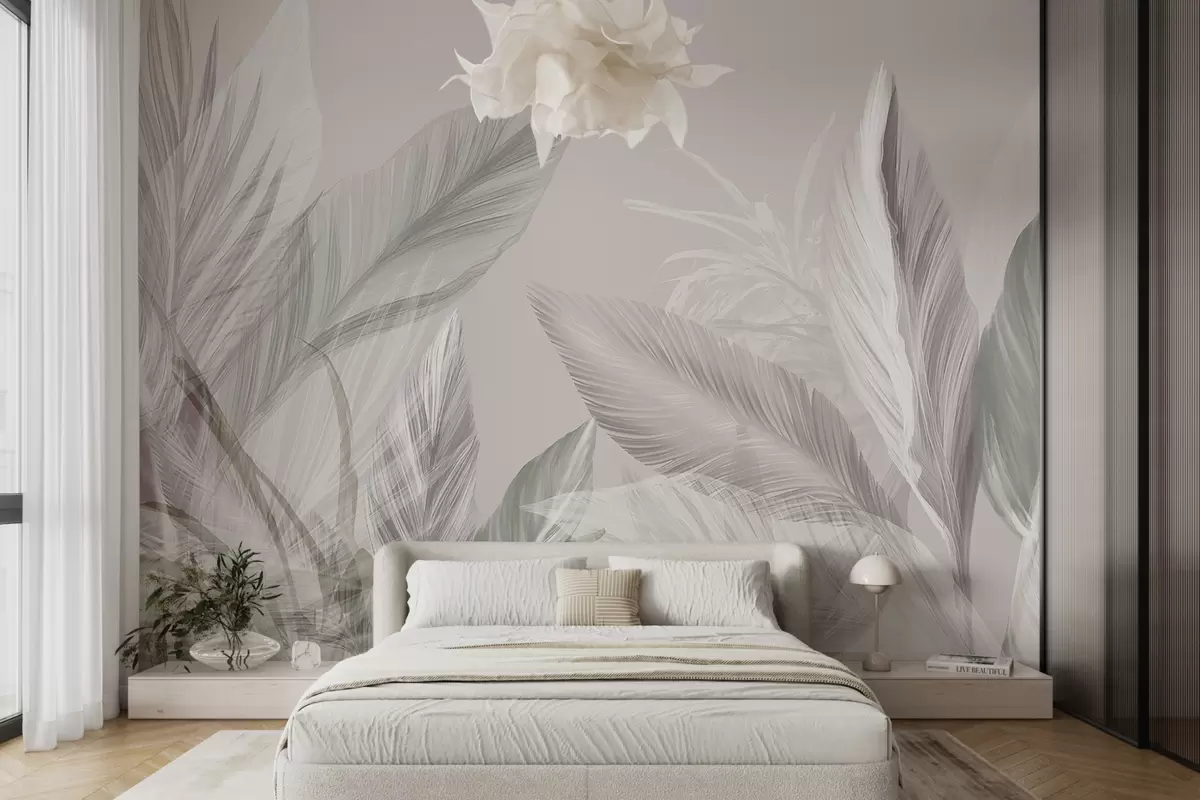 Fotomurales Plumas suaves de color blanco, rosa y gris y hojas tropicales flotando sobre un fondo claro. Nr. w08241v1