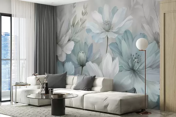 Fotomurales Un primer plano de una pintura artística de flores blancas y celestes parecidas a margaritas con fondos suaves y borrosos Nr. w08247
