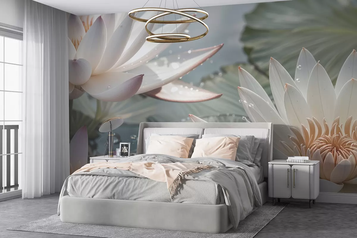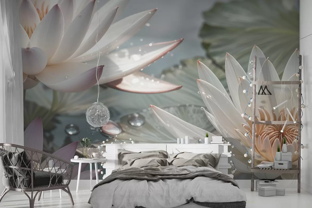 Fotomurales Primer plano de flores de loto blancas con gotas de agua en sus pétalos sobre un fondo verde difuminado Nr. w08252