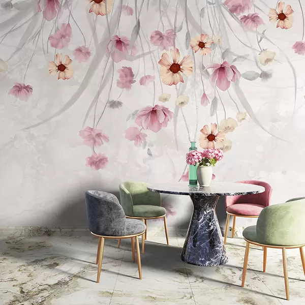 Fotomurales Delicadas flores de color rosa pastel y amarillo con centros amarillos que caen en cascada sobre un fondo suave y difuminado Nr. w08261v1