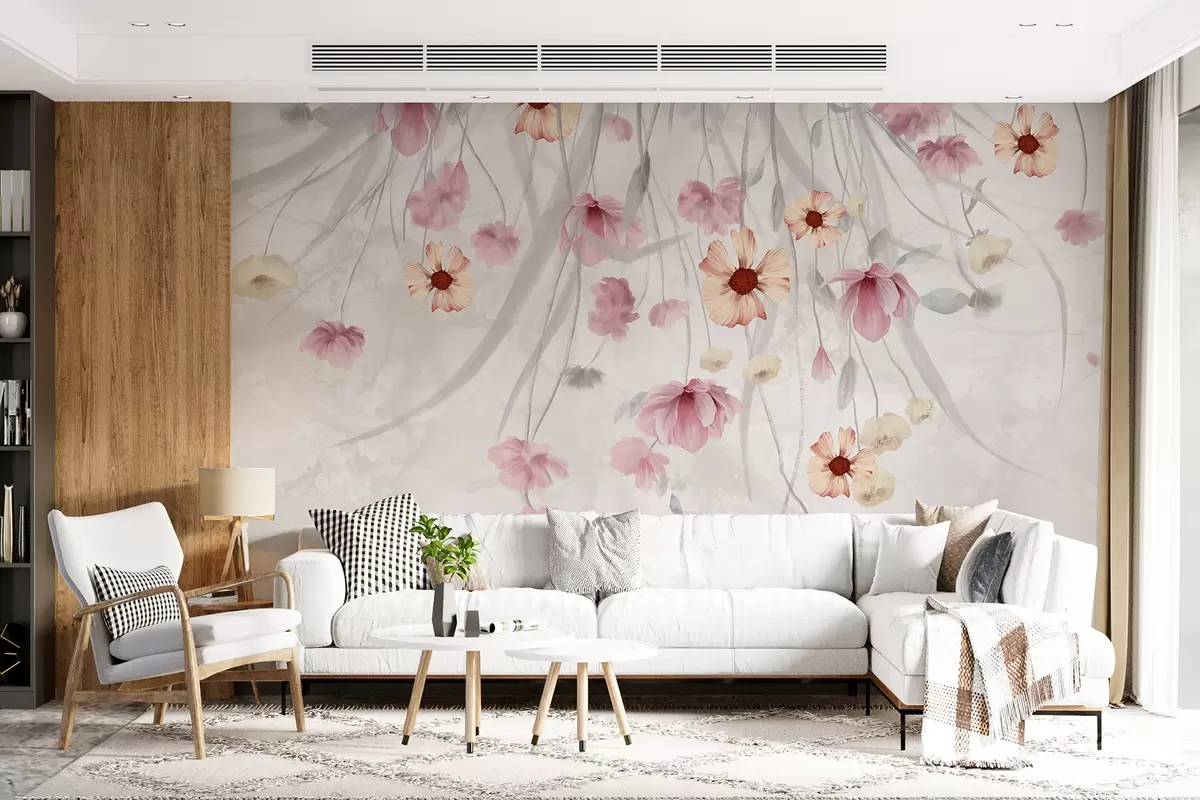 Fotomurales Delicadas flores de color rosa pastel y amarillo con centros amarillos que caen en cascada sobre un fondo suave y difuminado Nr. w08261v1