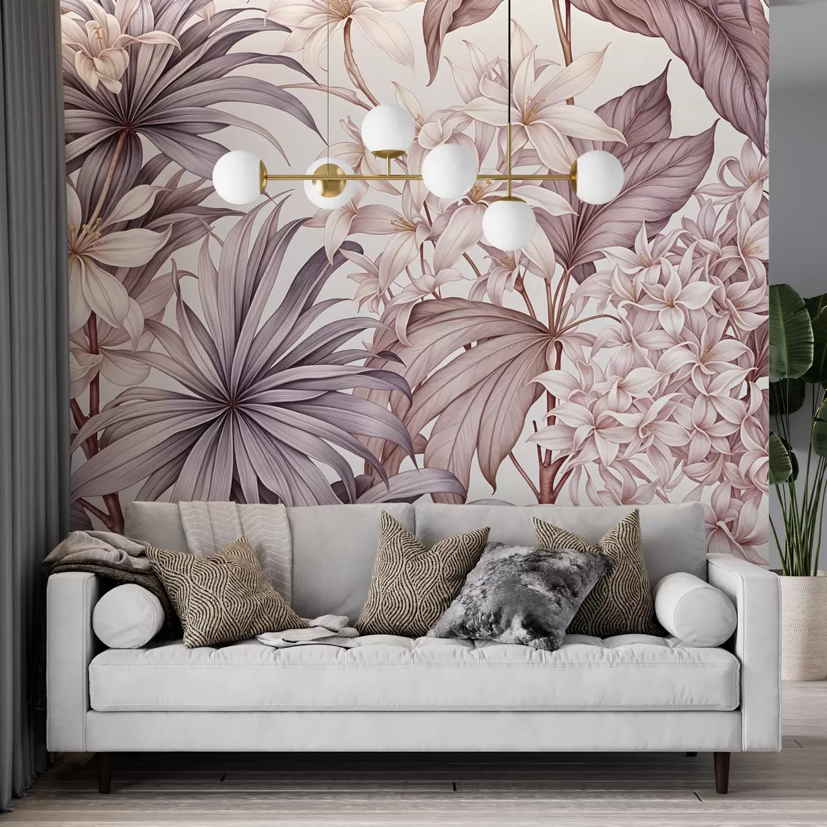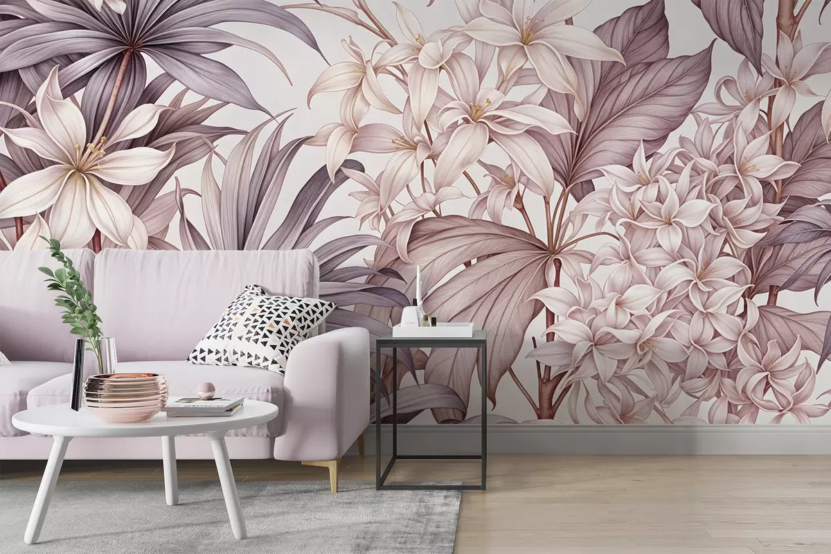 Fotomurales Estampado floral tropical con grandes flores blancas y rosa claro, hojas de bordo y fondo neutro Nr. w08318v1