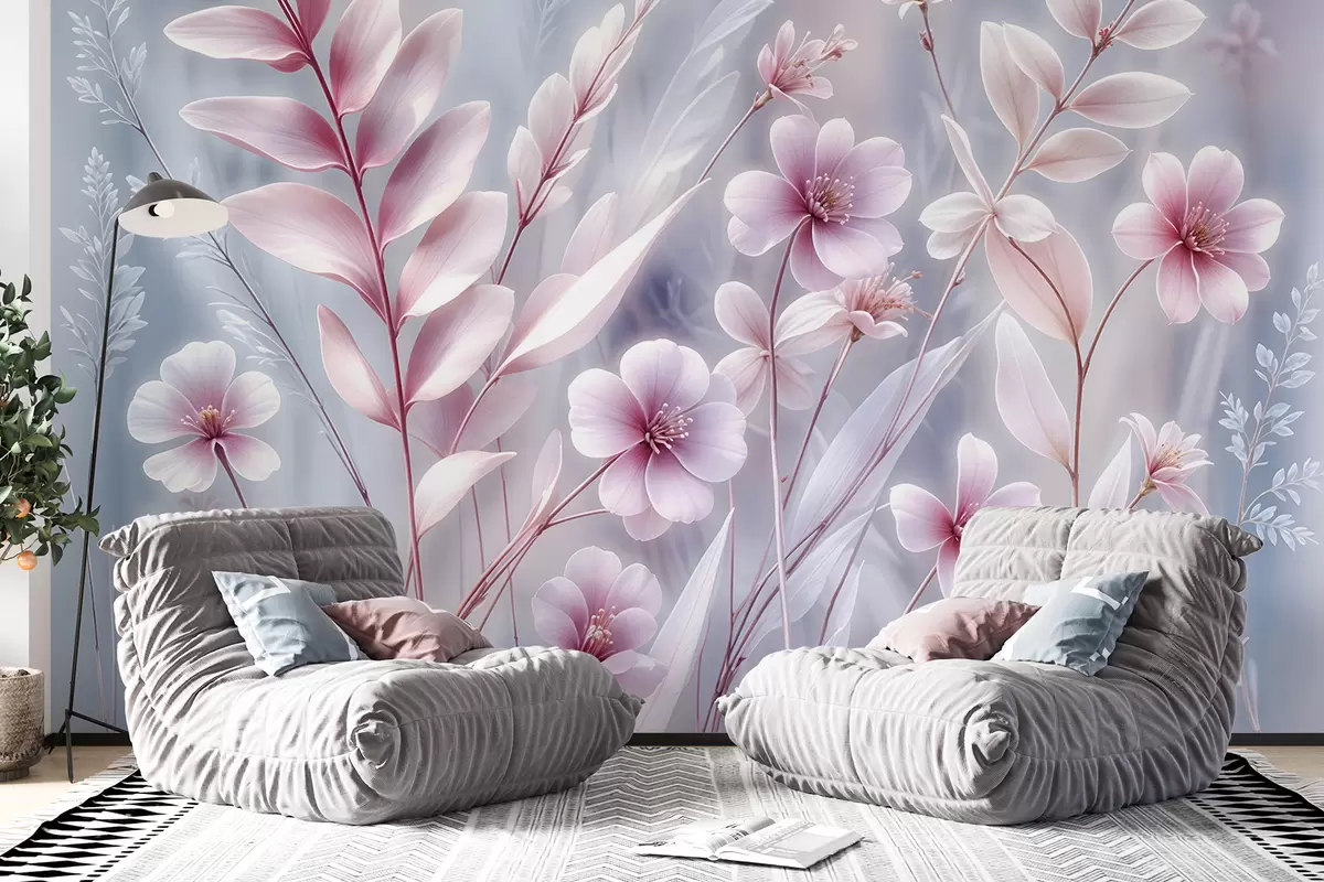 Fotomurales Delicadas flores rosas con suaves pétalos y hojas sobre un fondo abstracto gris pálido Nr. w08323