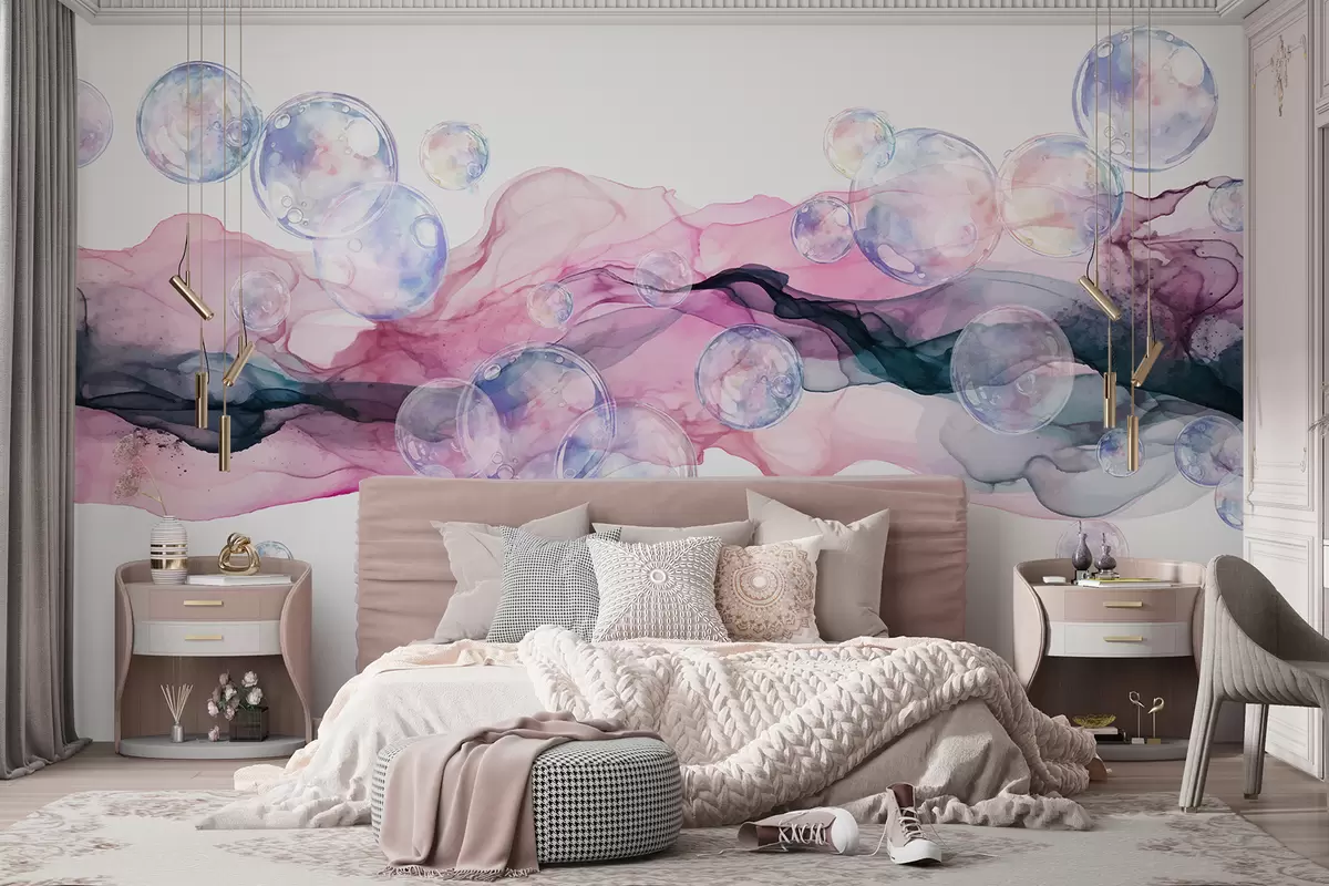 Fotomurales Coloridas formas fluidas abstractas con burbujas, remolinos de tonos rosas, azules y morados sobre fondo blanco Nr. w08337