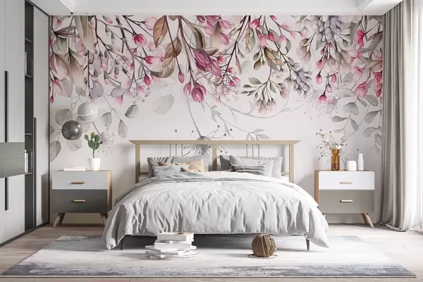 Fotomurales Delicadas ramas florales rosas y blancas con hojas y pétalos, sobre fondo gris pastel Nr. w08347