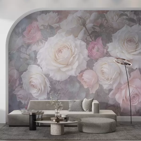 Fotomurales Rosas y peonías de suaves colores pastel sobre un fondo difuminado de textura gris brumosa Nr. w08352