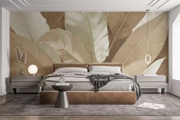 Fotomurales Primer plano de grandes hojas tropicales decorativas, exuberantes y texturizadas, en tonos marrones y beige Nr. w08373v1