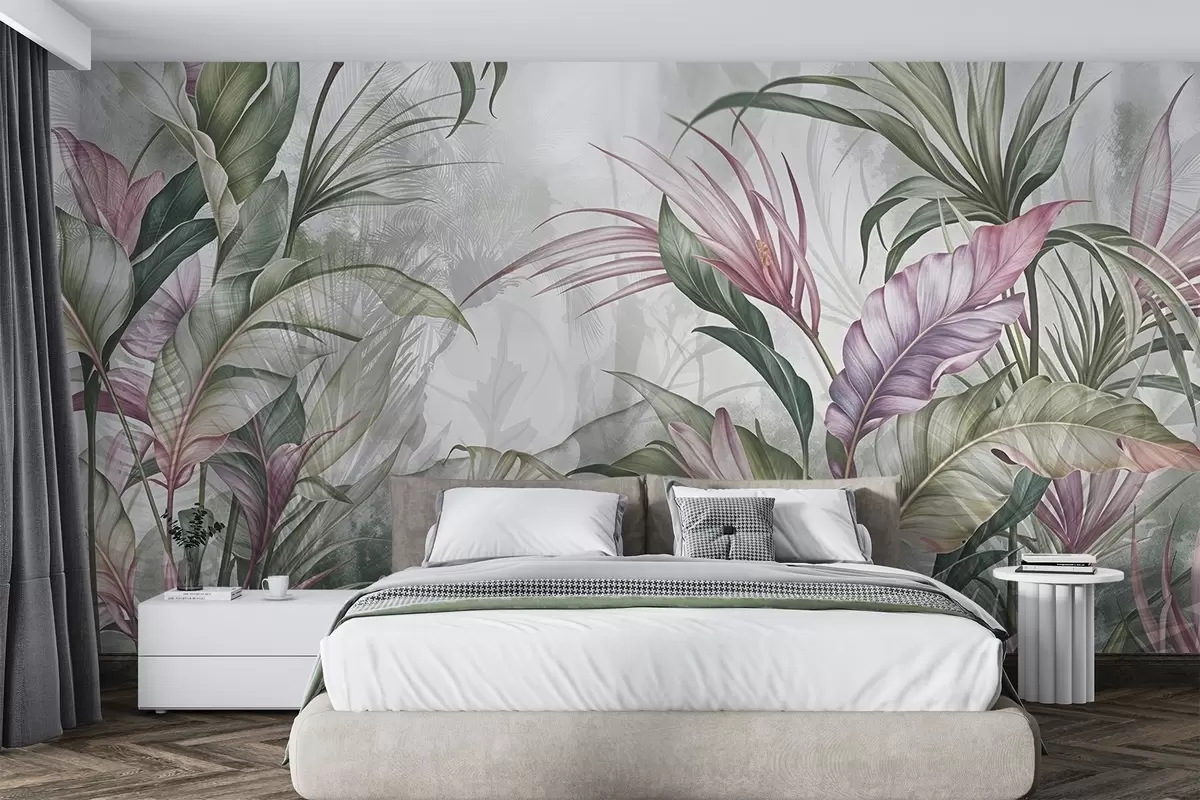 Fotomurales Selva tropical con grandes hojas verdes y flores de protea rosa con fondo borroso texturizado Nr. w08375