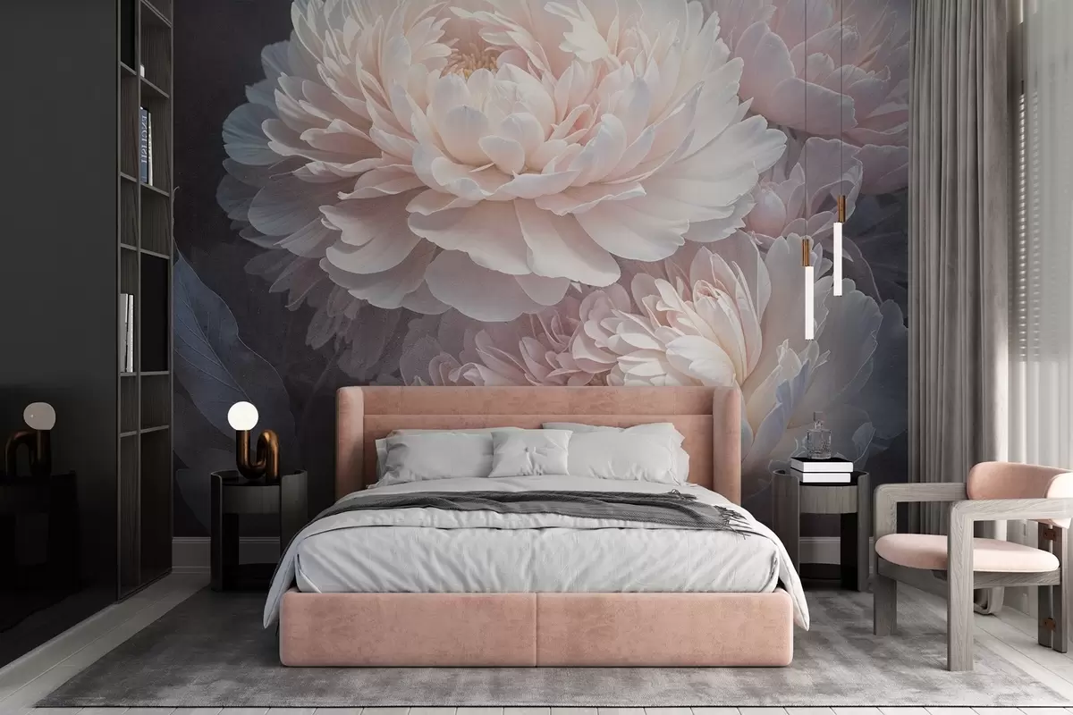 Fotomurales Primer plano de dos grandes y delicadas peonías rosas con pétalos y hojas suaves y esponjosos sobre un fondo difuminado Nr. w08382