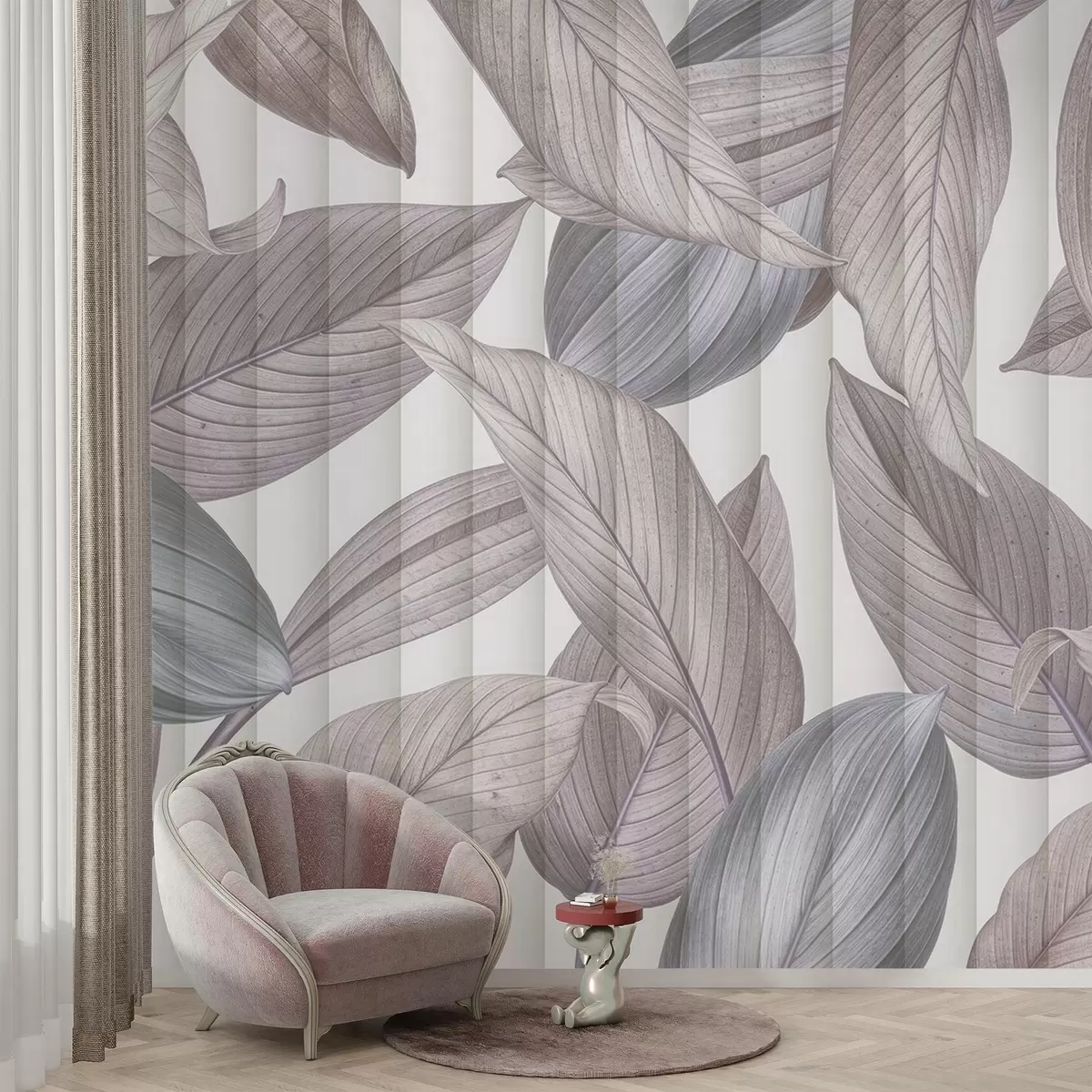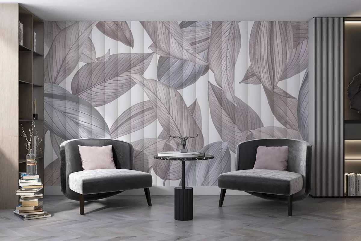Fotomurales Hojas abstractas detalladas en tonos azules, grises y rosa pastel sobre fondo claro Nr. w08388v1