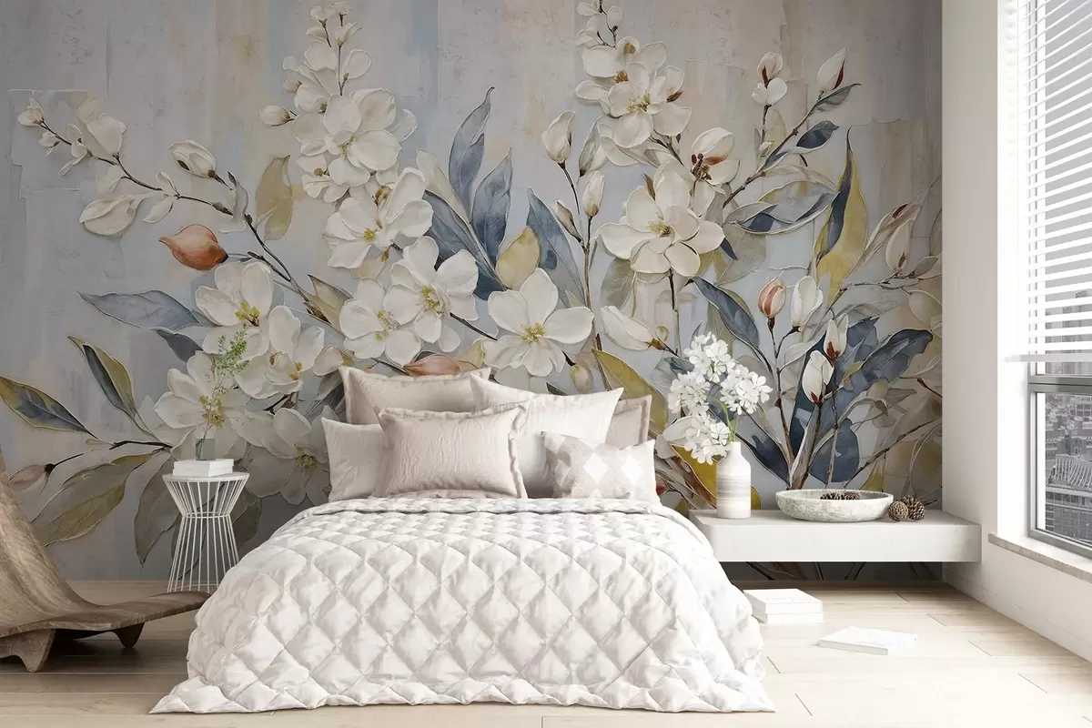Fotomurales Floral de delicadas flores blancas con centros amarillos, rodeadas de exuberantes hojas y ramas verdes Nr. w08399v1