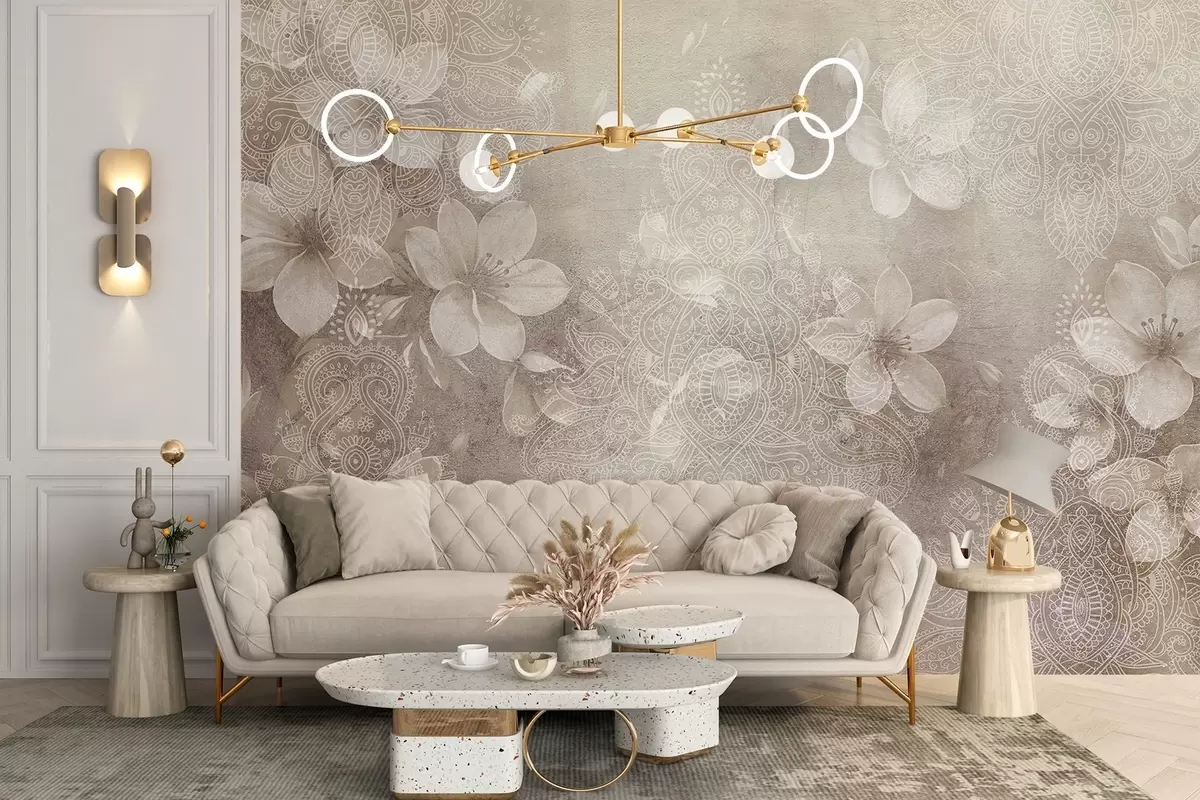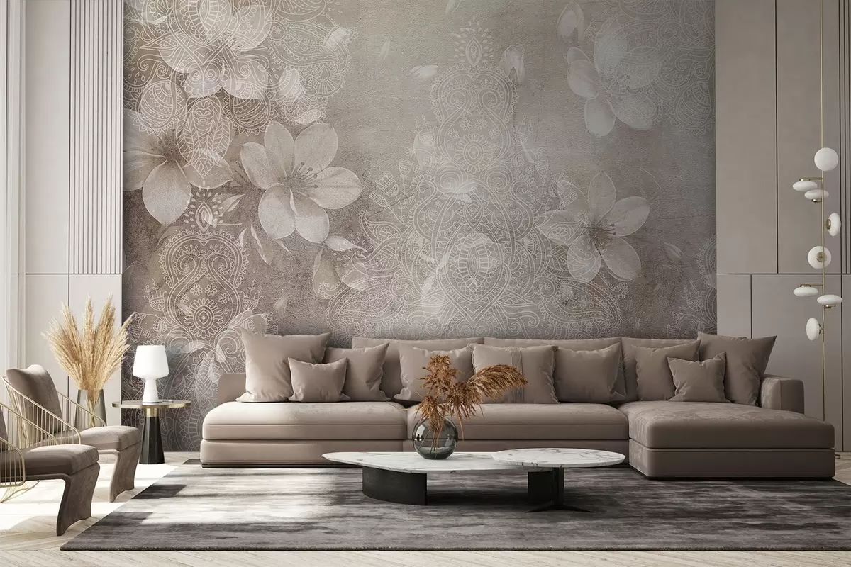 Fotomurales Dibujo suavemente enfocado de delicadas flores blancas sobre un fondo difuminado de encaje beige Nr. w08405v1