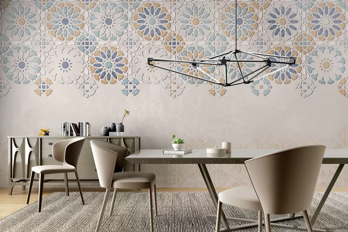 Fotomurales Una pared texturizada con un estampado repetido de diseños intrincados y ornamentados en tonos azules, grises y beige Nr. w08407