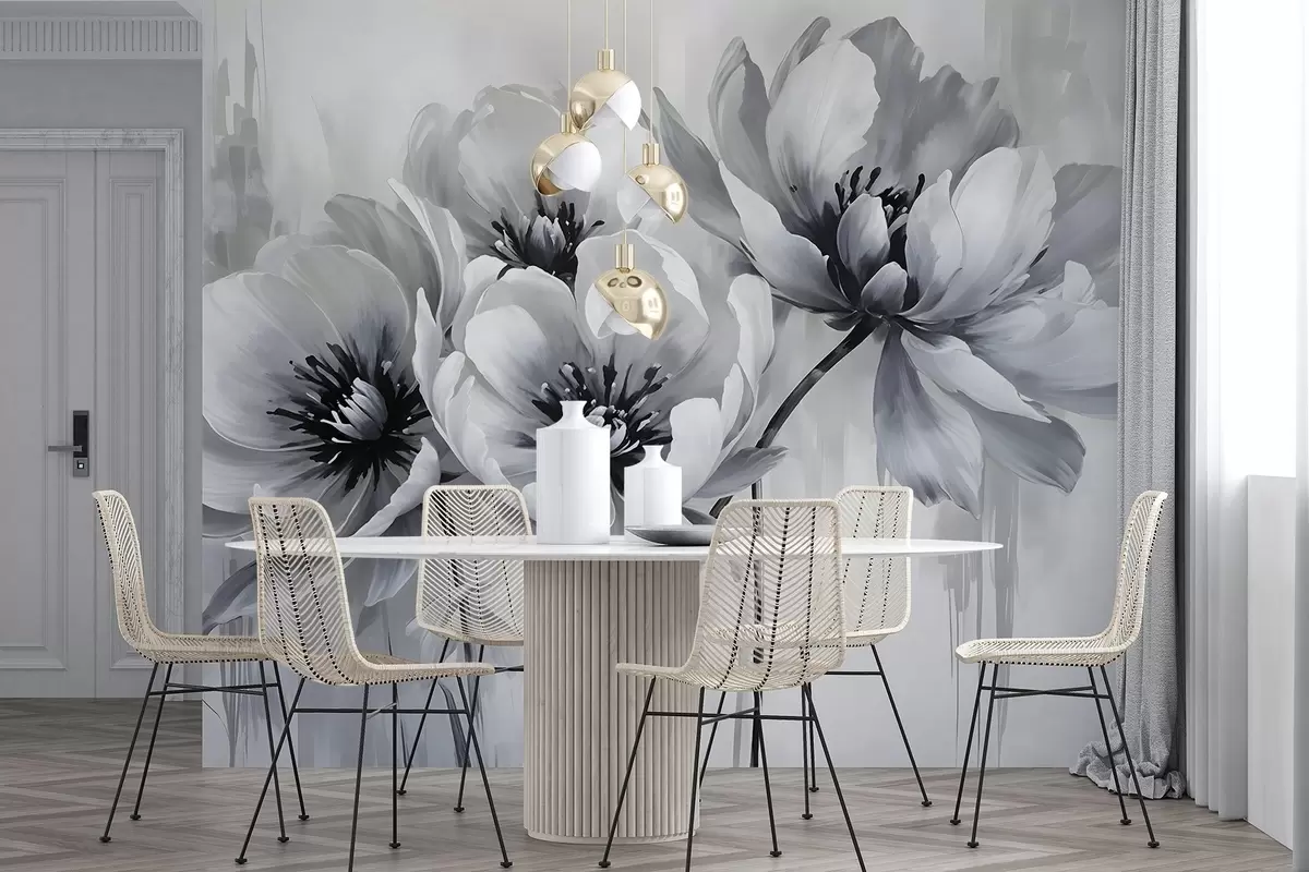 murales de pared Flores de tulipán monocromas con pétalos suaves y difuminados sobre un fondo claro w08418
