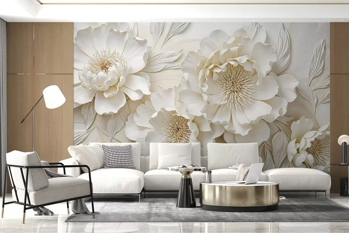 Fotomurales Elegantes y voluminosas flores de imitación de peonía blanca con suaves pétalos y centros amarillo pastel, sobre un fondo claro Nr. w08431