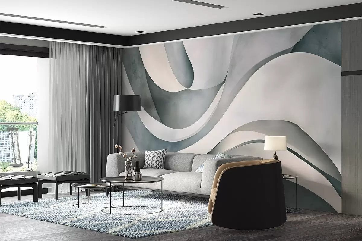 Fotomurales Formas curvas en blanco, azul y gris, creando un estampado minimalista, moderno y abstracto Nr. w08439v1