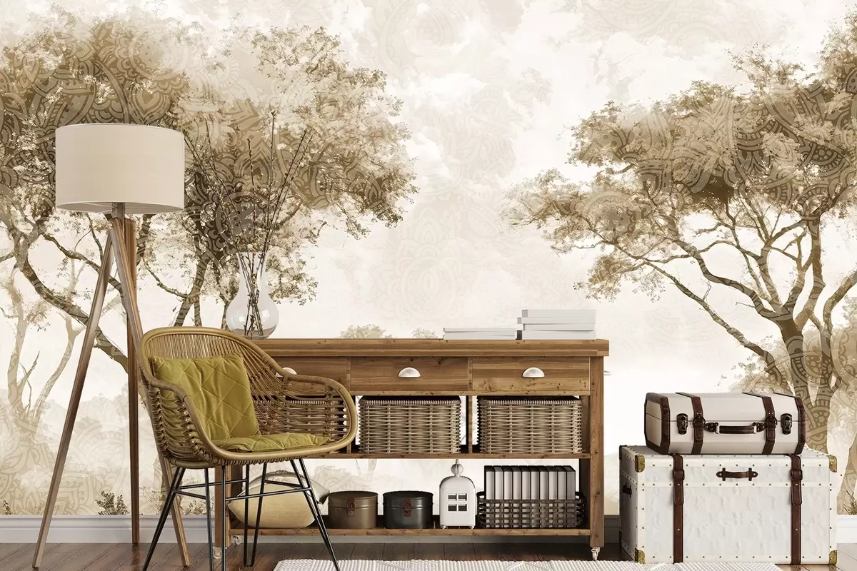 Fotomurales Un paisaje brumoso y sereno con árboles silueteados en primer plano y una suave niebla en tonos marrones y beige Nr. w08442v2