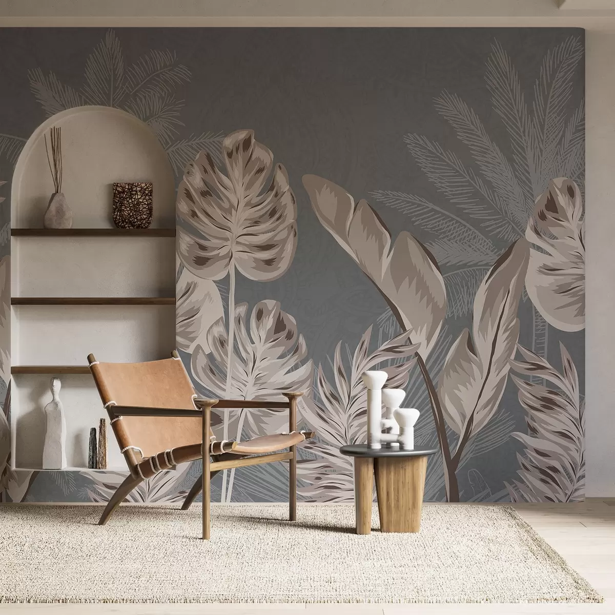 Fotomurales Grandes y delicadas hojas de color beige sobre un fondo gris apagado, que crean una atmósfera serena y etérea Nr. w08449