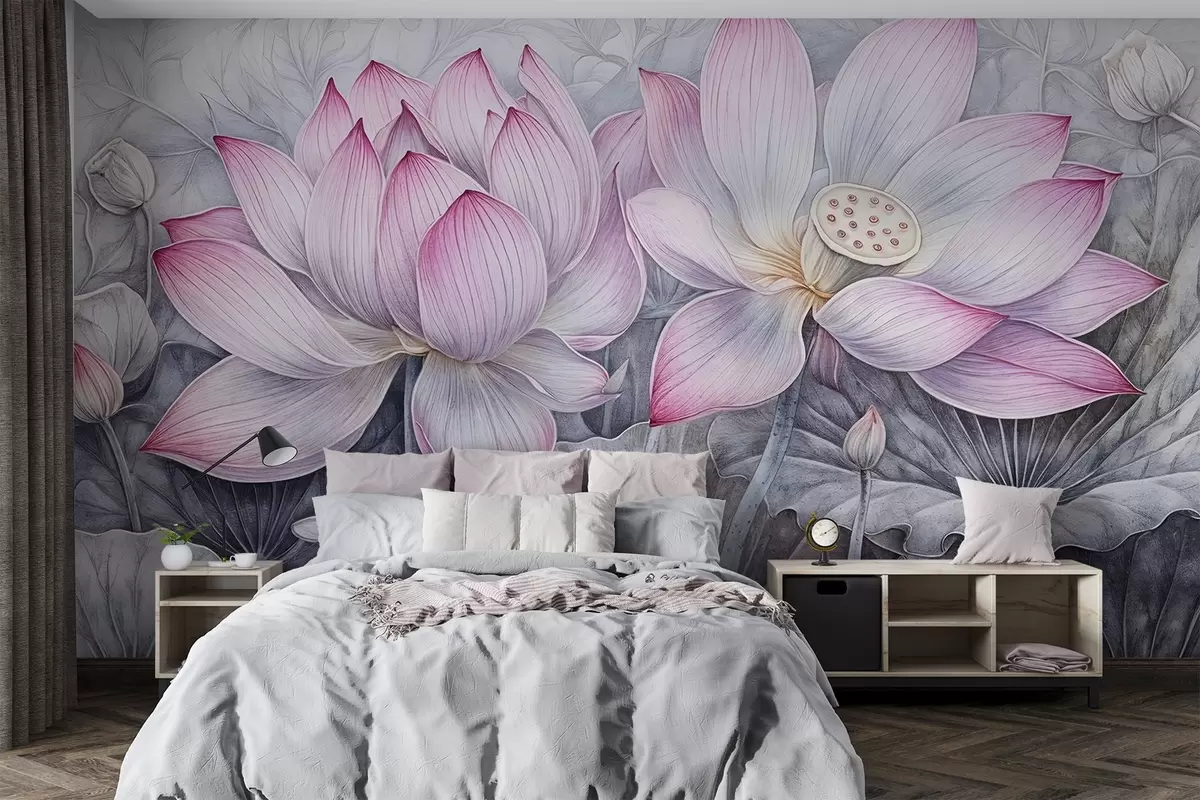 Fotomurales Varias flores de loto rosas grandes con textura detallada y hojas y tallos de color verde grisáceo sobre un fondo claro Nr. w08465