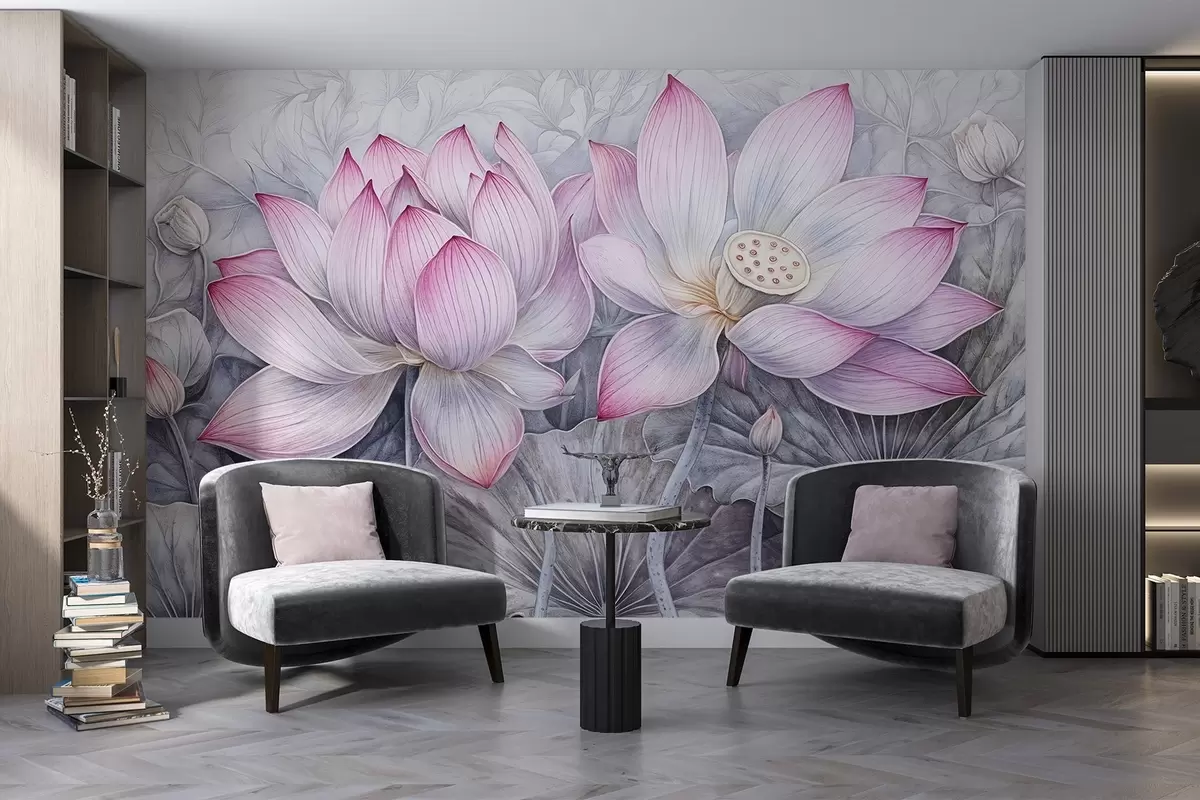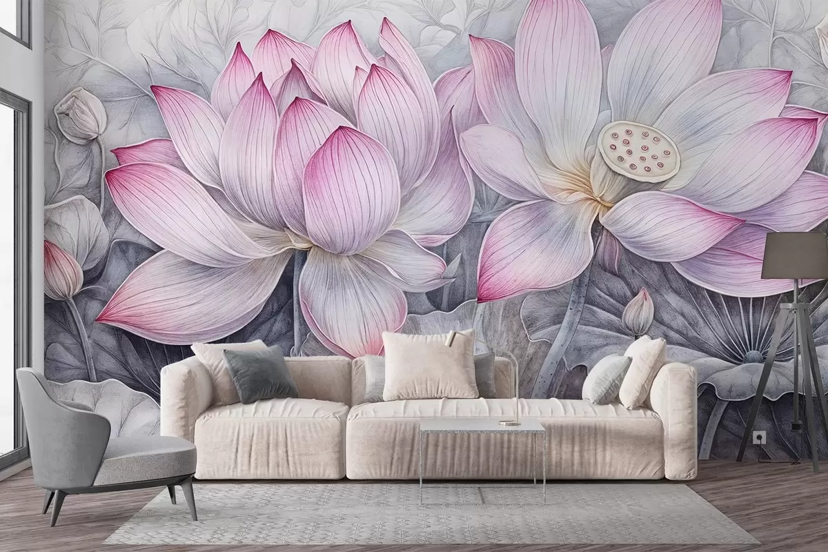Fotomurales Varias flores de loto rosas grandes con textura detallada y hojas y tallos de color verde grisáceo sobre un fondo claro Nr. w08465
