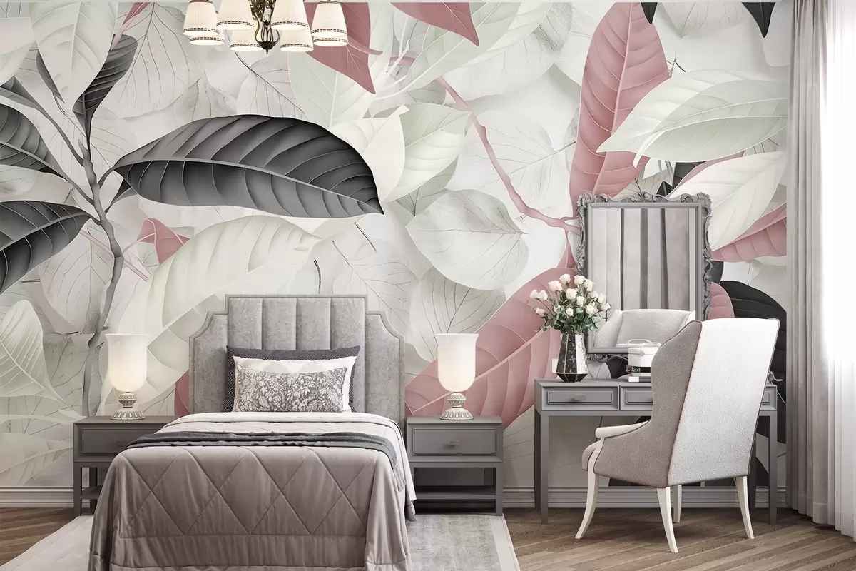 Fotomurales Gran estampado de hojas rosas y grises sobre un fondo con textura de hojas claras, que crea una exuberante sensación tropical Nr. w08468