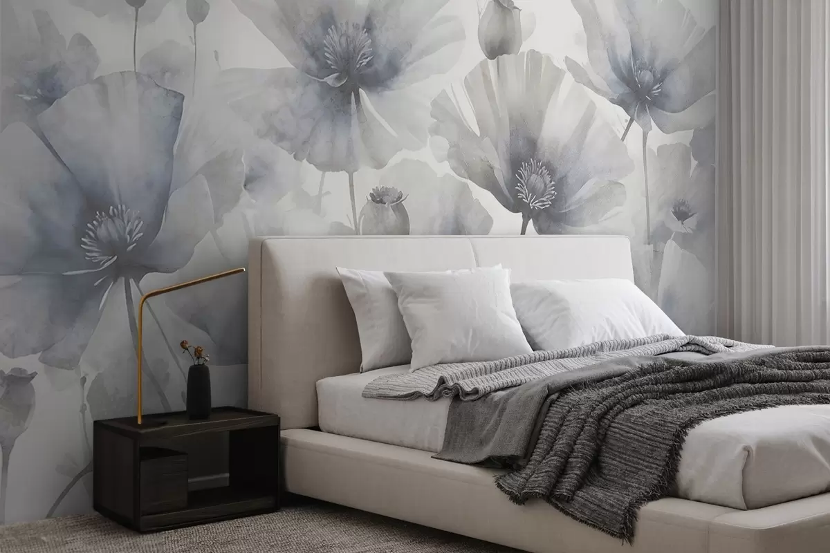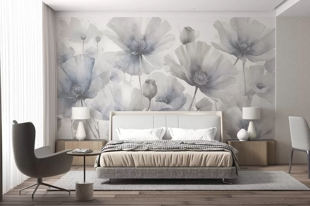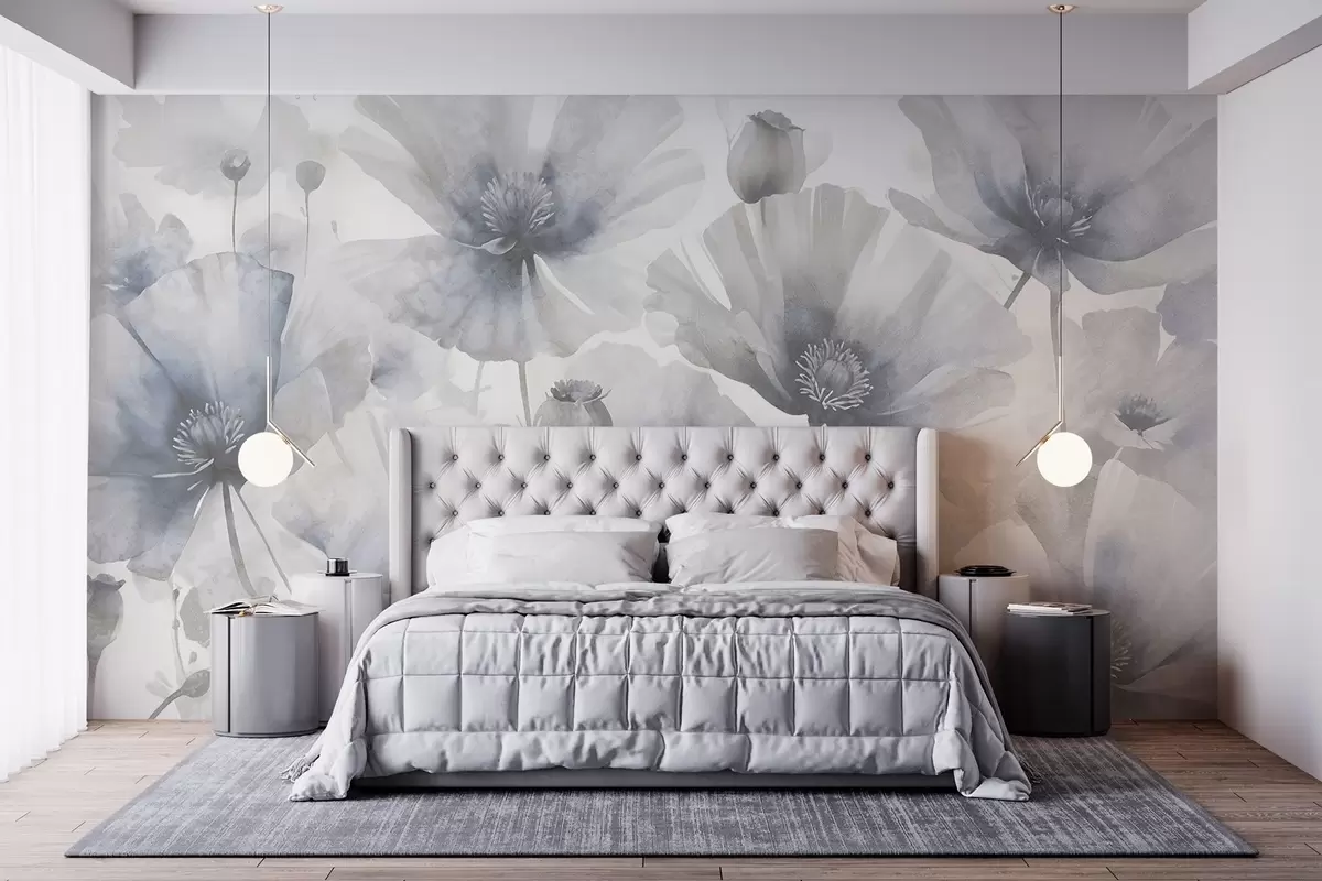 Fotomurales Delicadas flores grunge grises y blancas con pétalos suaves y difuminados sobre fondo blanco Nr. w08526