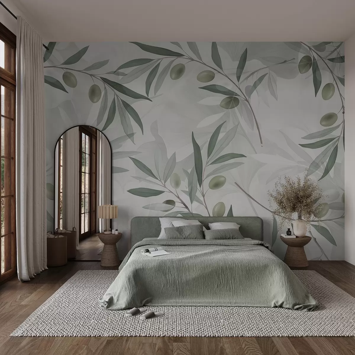 Fotomurales Ramas de olivo con hojas verdes y aceitunas sobre fondo claro Nr. w08576