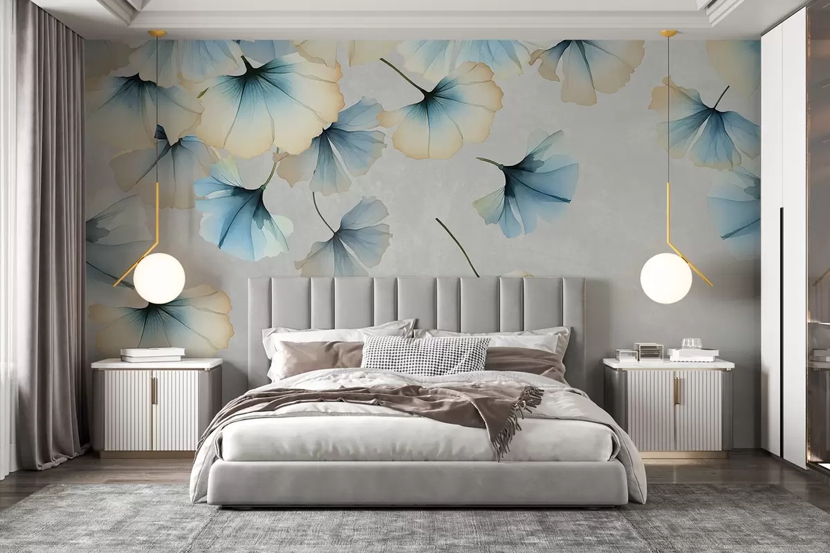 Fotomurales Hojas de ginkgo de colores pastel, azules y amarillas, con delicados pétalos flotando en el aire sobre un fondo de texturas Nr. w08578v1