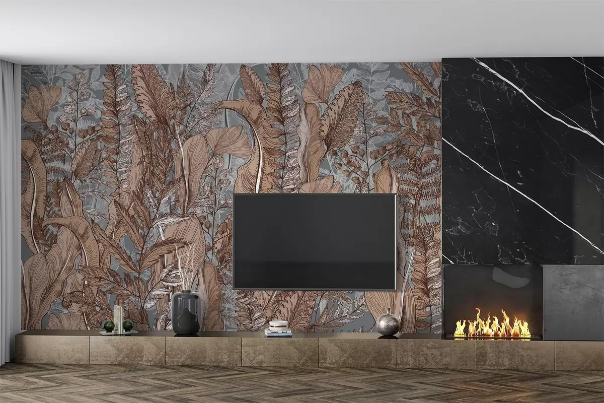 Fotomurales Un bosque frondoso y verde con varios tipos de helechos, hojas y follaje en tonos marrones, azules y grises Nr. w08579v1