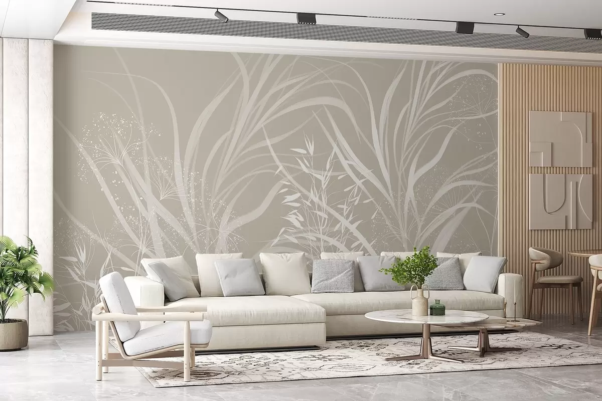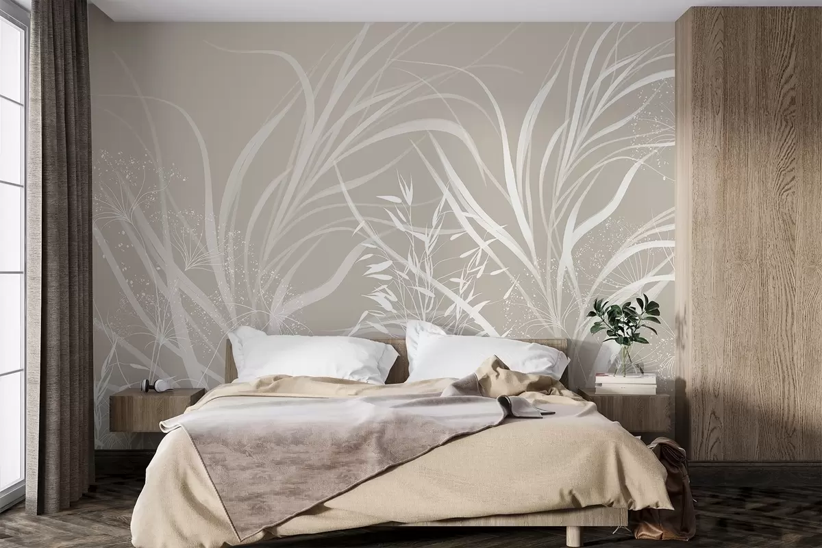 Fotomurales Delicado y moderno estampado floral minimalista en blanco sobre fondo beige pastel claro Nr. w08583
