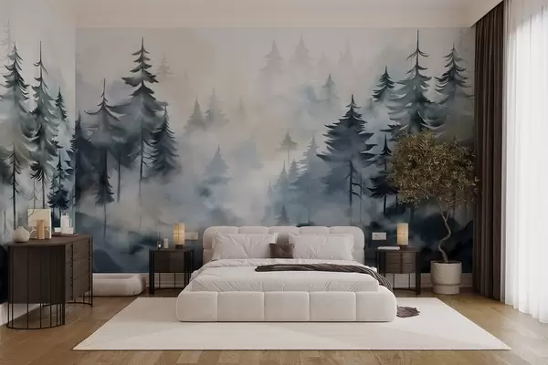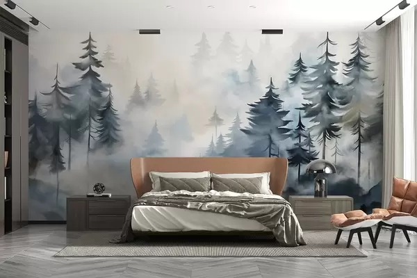 Fotomurales Un paisaje de bosque brumoso con altos pinos en el fondo de niebla en estilo acuarela Nr. w08584