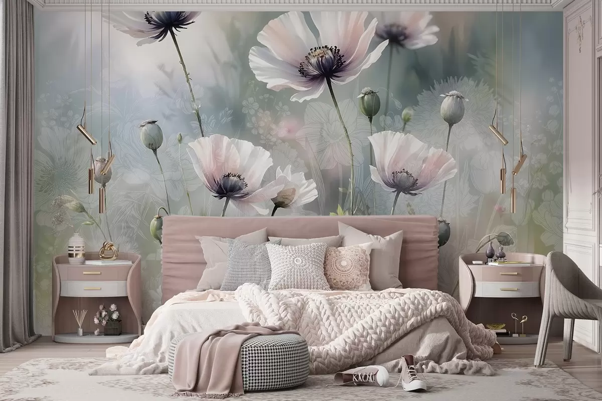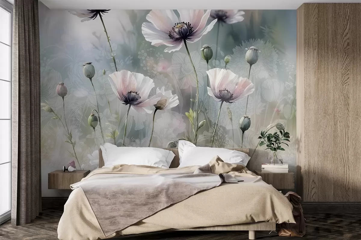 Fotomurales Delicadas amapolas rosas y moradas con tallos y capullos verdes sobre un fondo de textura suave y difuminada Nr. w08585