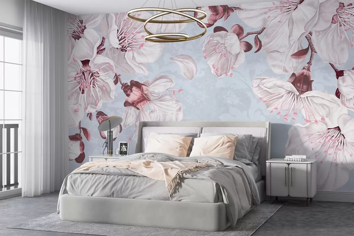 Fotomurales Estampado floral con grandes flores de cerezo rosas y blancas sobre un fondo de textura azul claro Nr. w08601