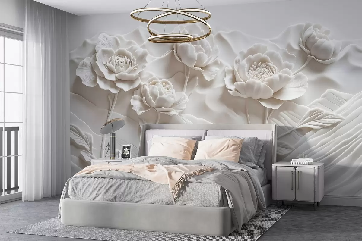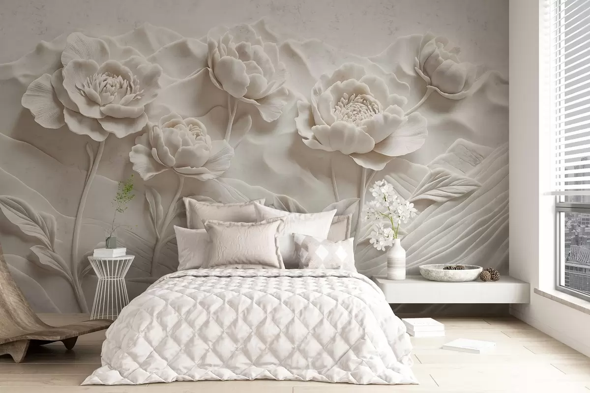 Fotomurales Imitación floral blanca de escultura en relieve con grandes y detalladas flores de peonía sobre fondo liso Nr. w08612