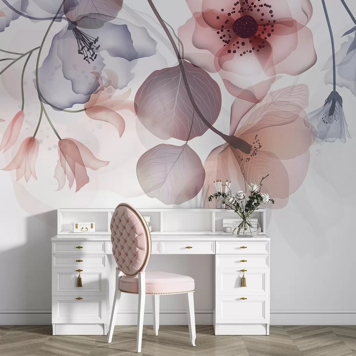 Fotomurales Delicadas flores translúcidas rosas y grises con pétalos suaves y centros oscuros, sobre un fondo claro Nr. w08613