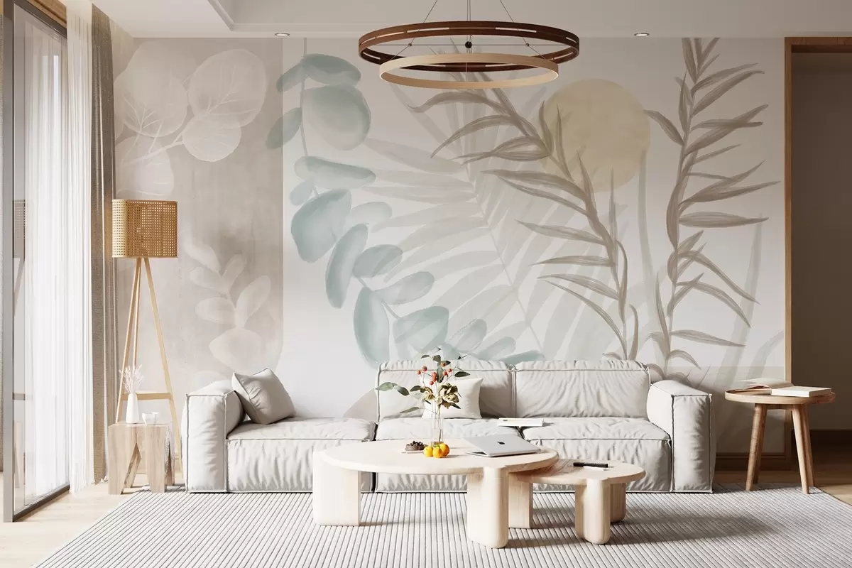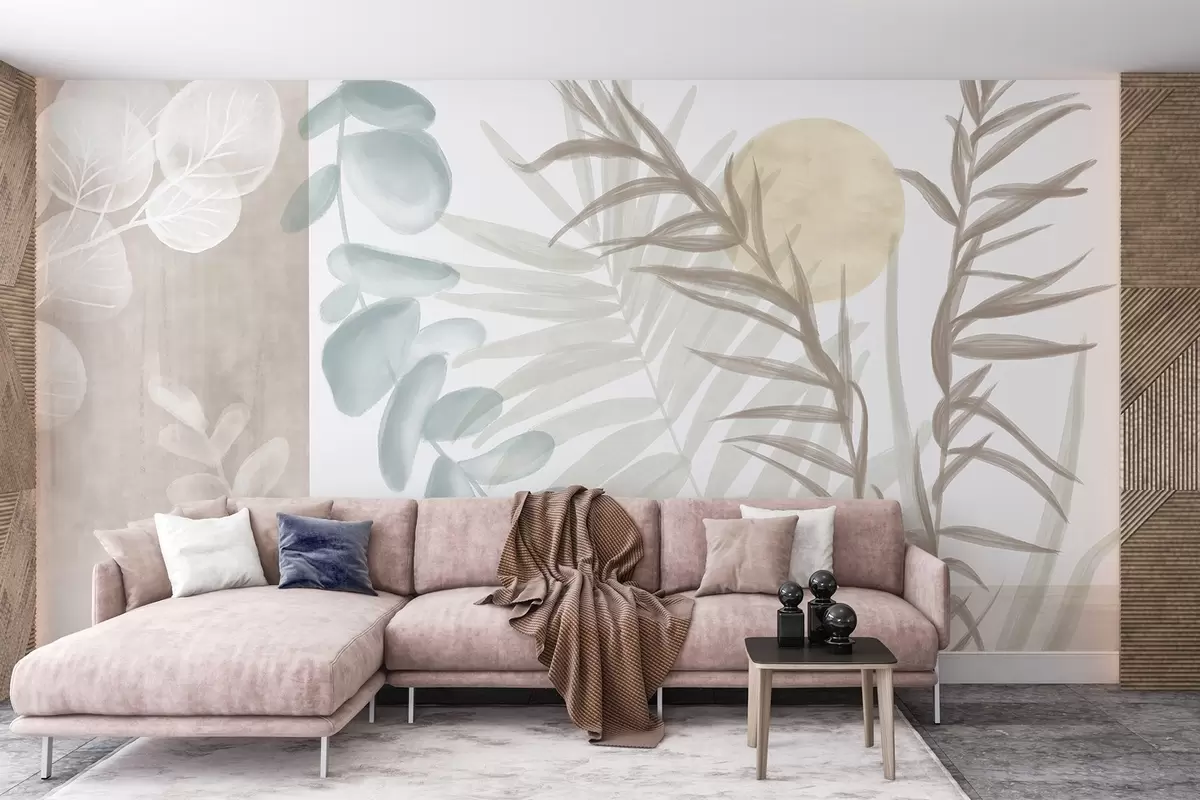 Fotomurales Un estampado abstracto minimalista con hojas estilizadas y eucaliptos con formas orgánicas suaves y beige en colores pastel apagados Nr. w08648