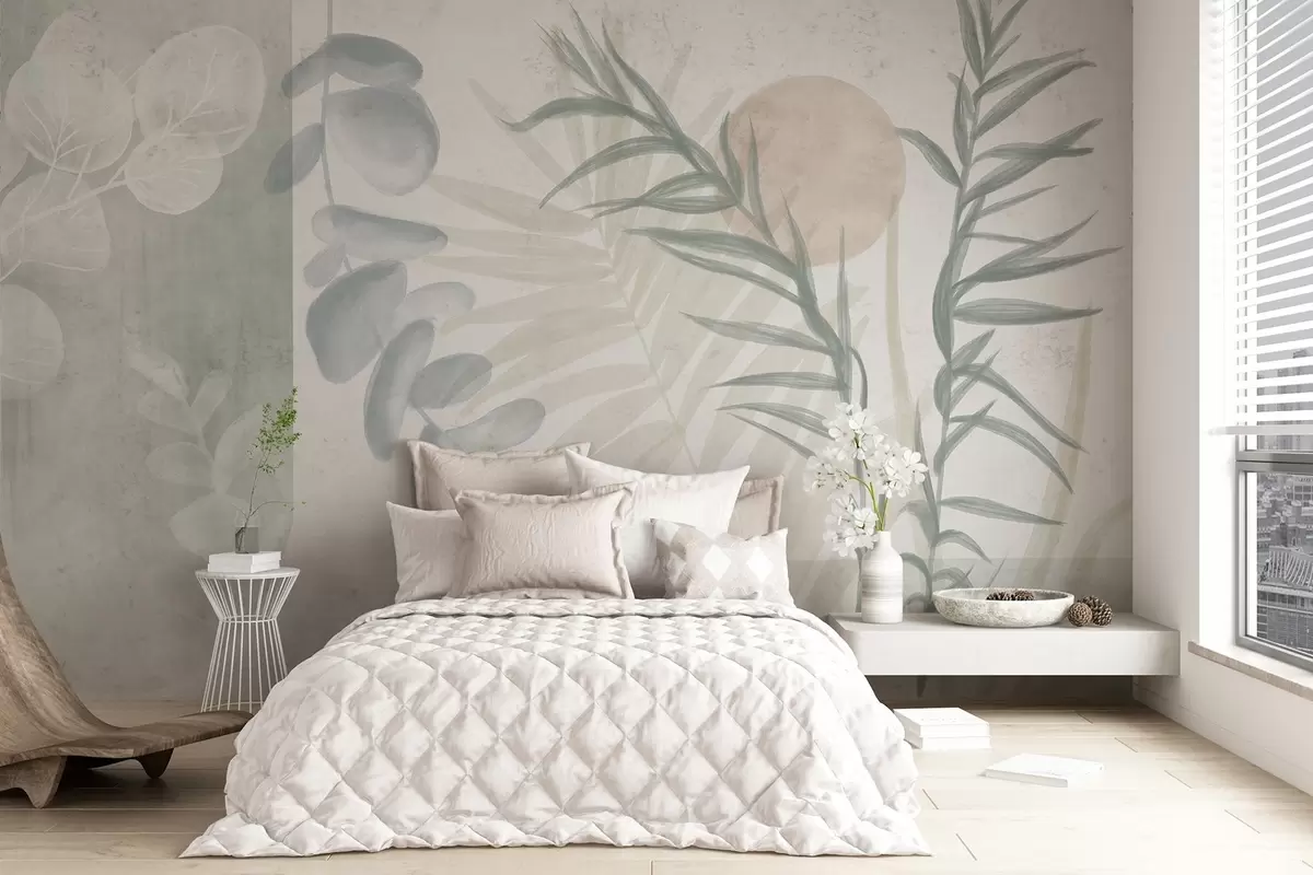 Fotomurales Un estampado abstracto minimalista con hojas estilizadas y eucaliptos de suaves formas orgánicas azules en colores pastel apagados Nr. w08648v1